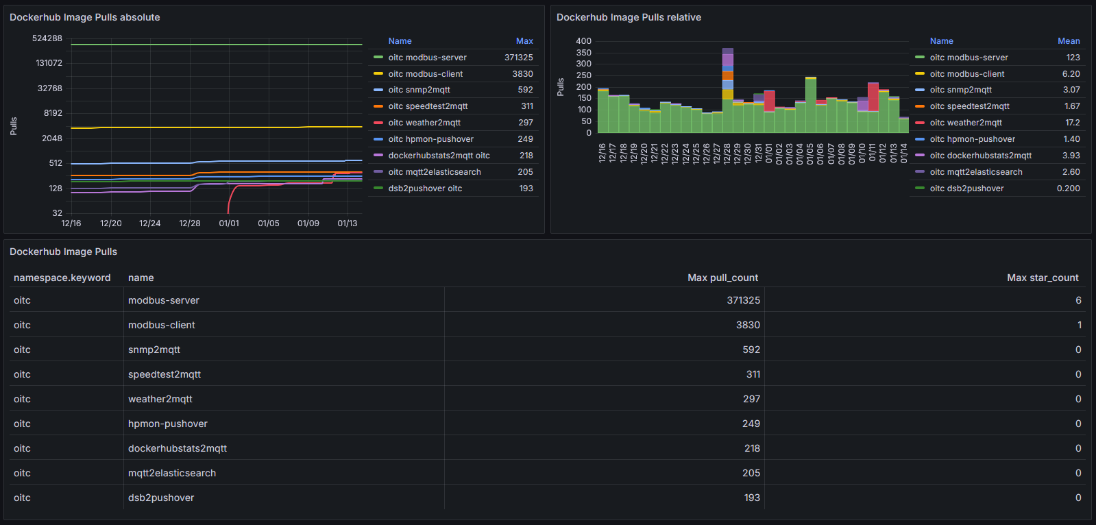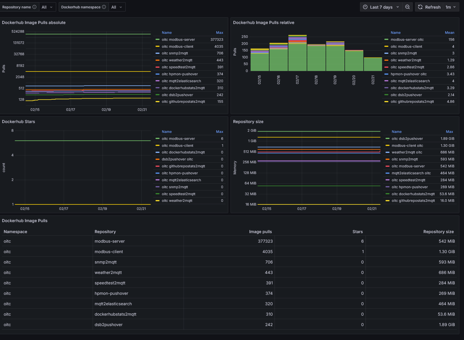 - oitc/dockerhubstats2mqtt collects metrics from Docker Hub and pushes them to an MQTT