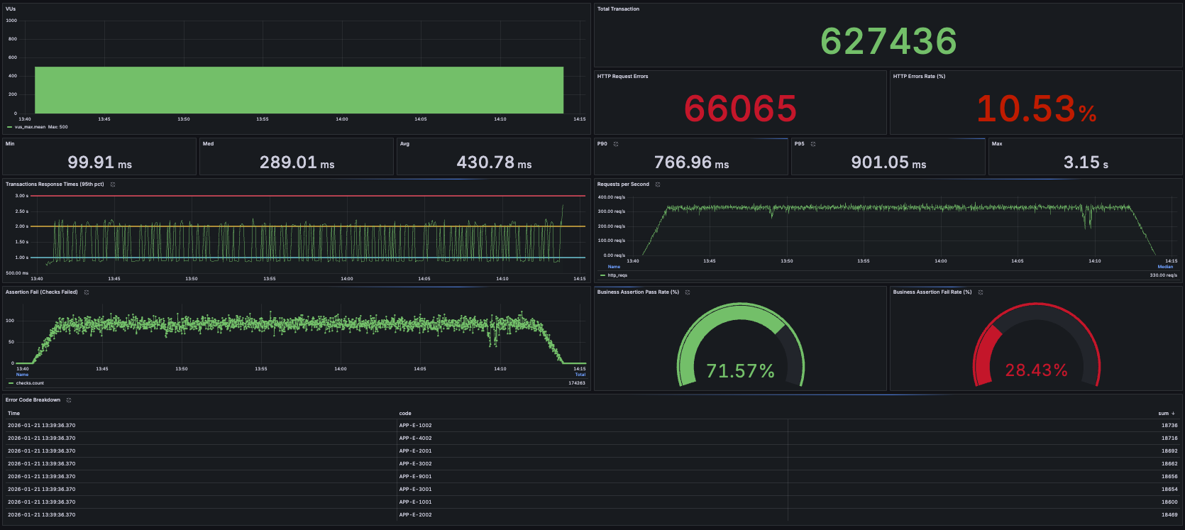 Grafana dashboard for visualizing k6 load test results using InfluxDB 1.x (InfluxQL).