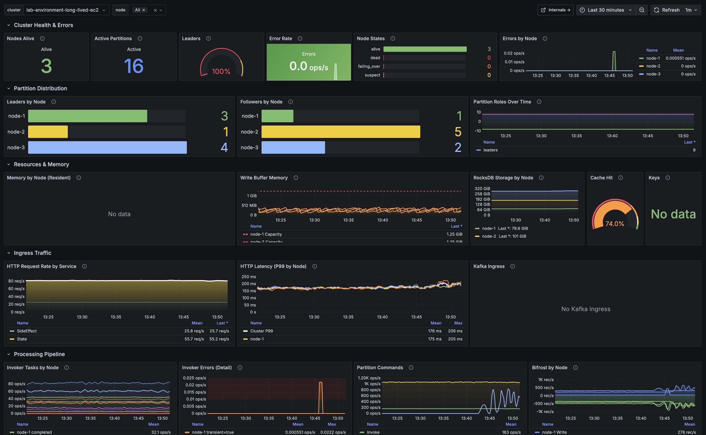 - Cluster Health & Errors - Node count, partition status, leader distribution, and error rates