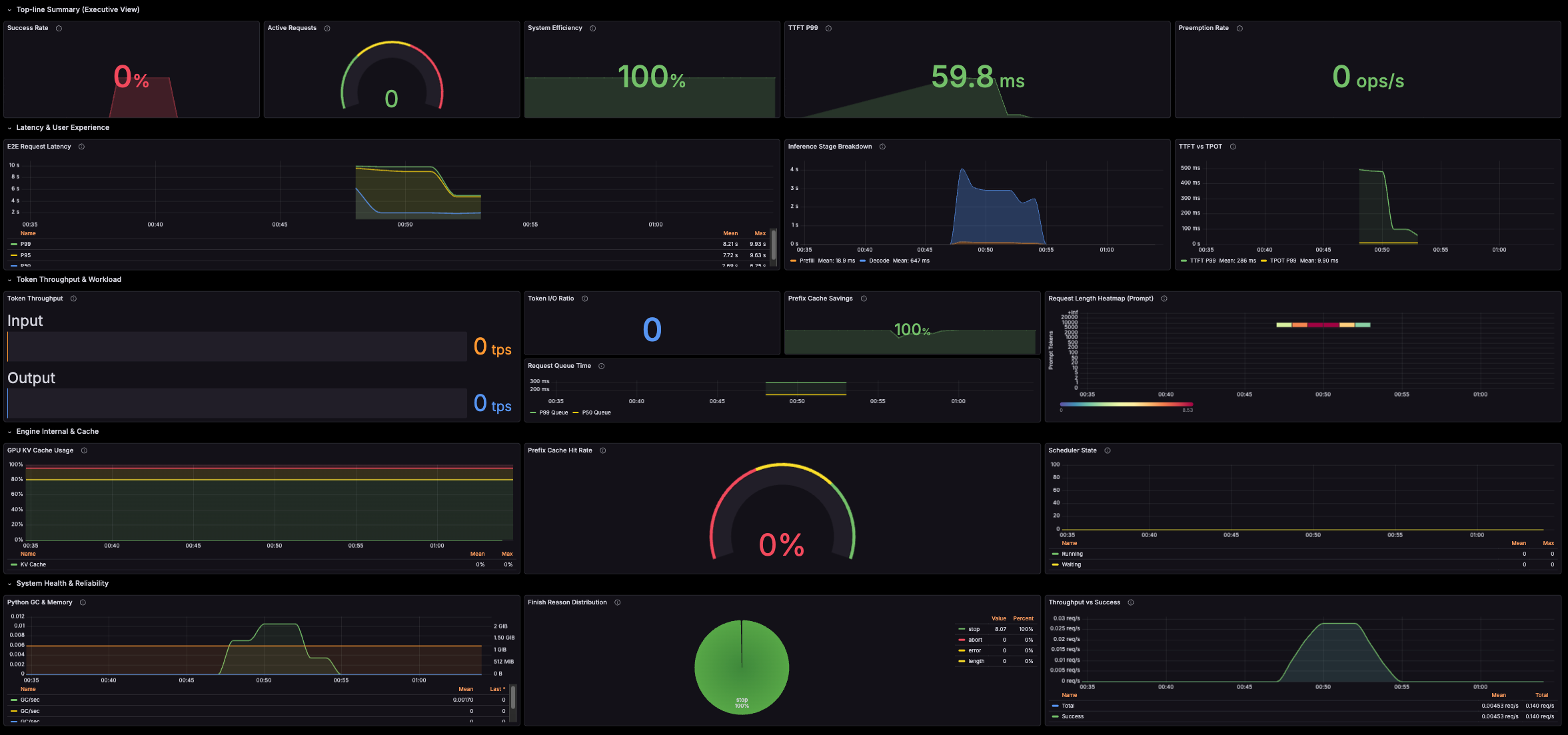 The vLLM Monitoring - V2 dashboard uses the prometheus data source to create a Grafana dashboard with the bargauge, gauge, heatmap, piechart, stat and timeseries panels.
