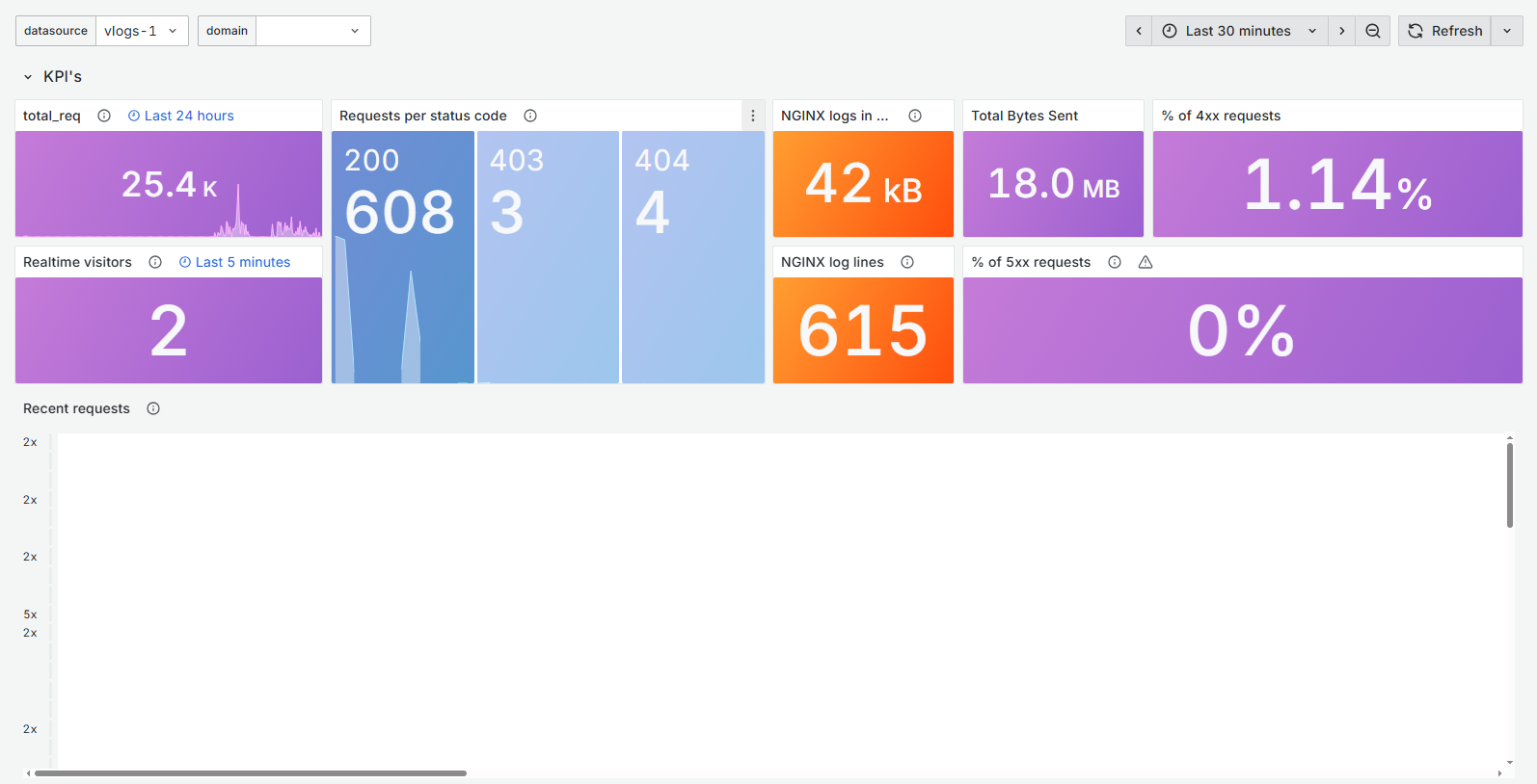 A high-performance Nginx insights dashboard designed for modern observability stacks using Vector (collector) and VictoriaLogs (storage). Leveraging the power of LogsQL, this dashboard runs real-time aggregations on massive log volumes with sub-second latency.