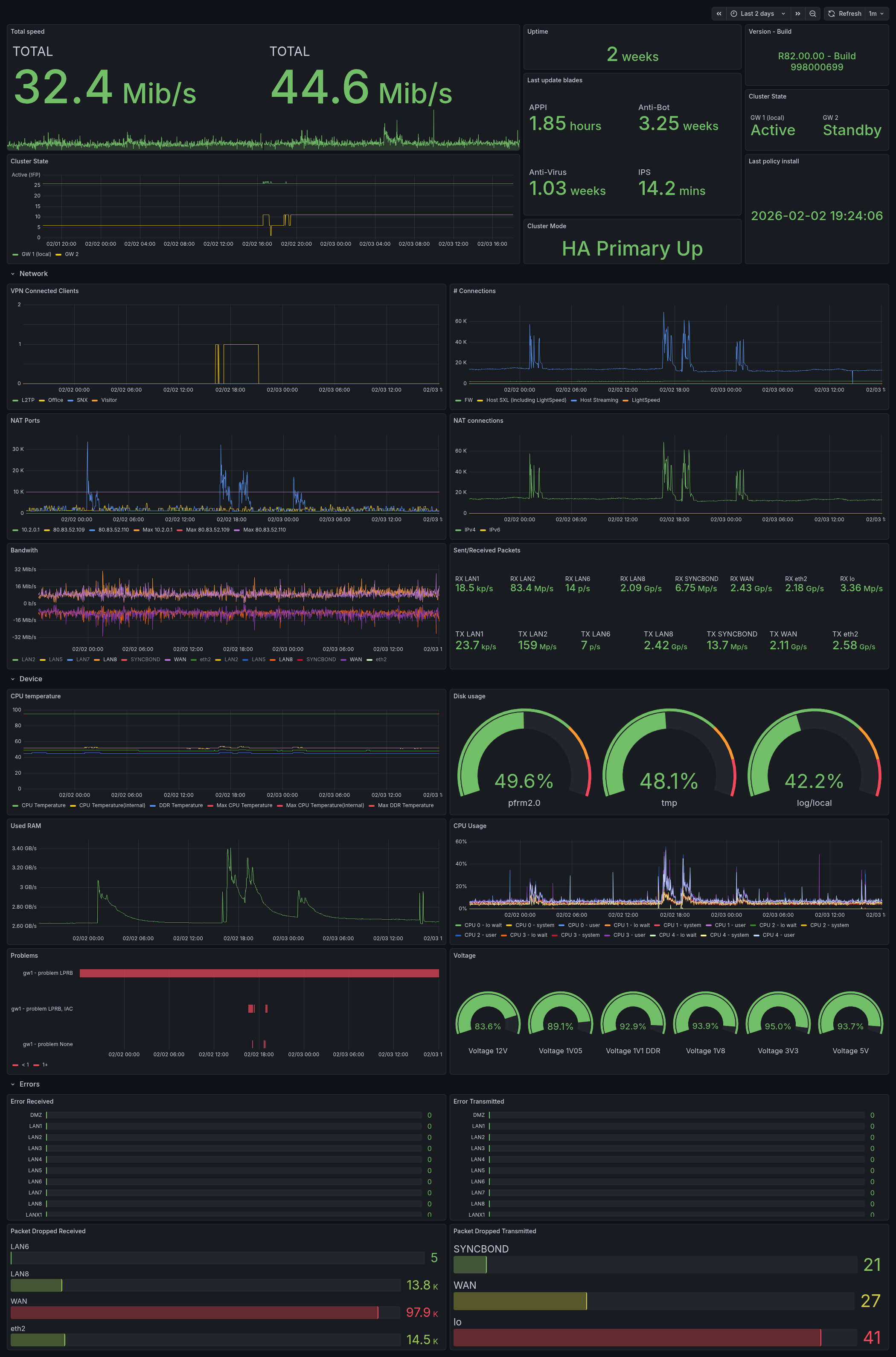 A Grafana dashboard for monitoring Check Point firewalls via Prometheus and CPviewExporter.