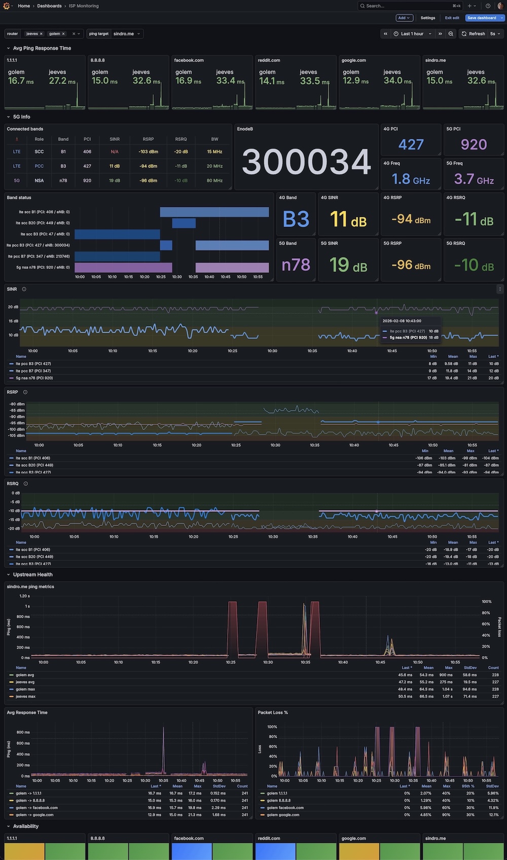A comprehensive dashboard combining enterprise-grade ISP latency monitoring with deep-level cellular telemetry. Designed specifically for OpenWrt gateways using Quectel RM520-GL modems (and compatible AT-command based 5G modems). 🔥 Key Features: Advanced Radio Telemetry: Real-time visualization of 5G (NR) and 4G (LTE) signal health. Tracks RSRP, RSRQ, and SINR with industry-standard RF color thresholds. Cell & Band History: "Flight recorder" view for your connection. Visualizes Carrier Aggregation (CA) states, connected Bands, PCIs, and eNodeB IDs over time using State Timelines. Network Health: Multi-target ping monitoring (DNS, Gateway, WAN) with jitter and packet loss analysis to correlate signal drops with lag spikes. Carrier Aggregation Table: Live view of Primary (PCC) and Secondary (SCC) component carriers including bandwidth and frequency. ⚙️ Requirements: Prometheus Node Exporter with Lua plugin enabled. Quectel 5G Tools Exporter: https://github.com/vjt/quectel-5g-tools Credits: Forked and supercharged from ISP Monitoring (ID 14206).