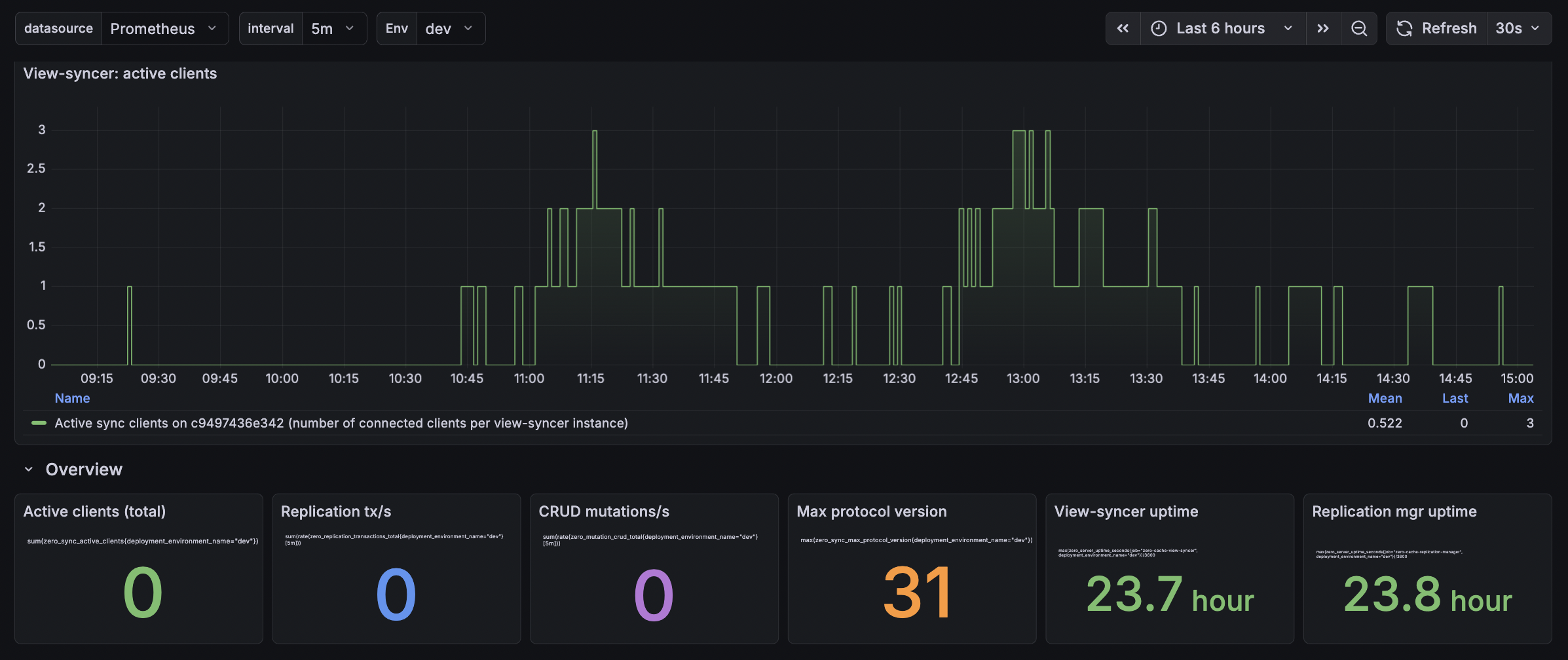 OverviewKey stats: total active clients, replication tx/s, CRUD mutations/s, max protocol version, view-syncer and replication-manager uptimes.