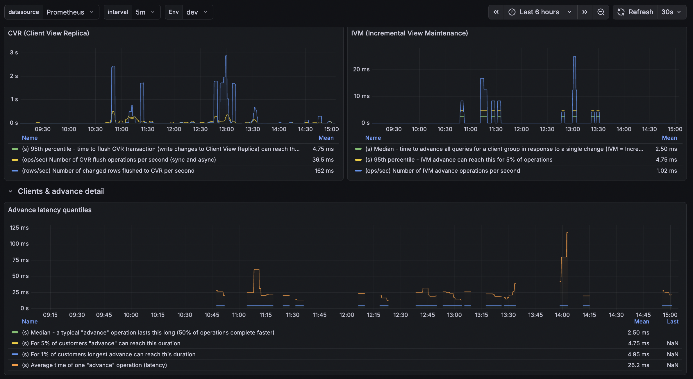 CVR & IVMClient View Replica flush latency and throughput; IVM advance latency and throughput.
