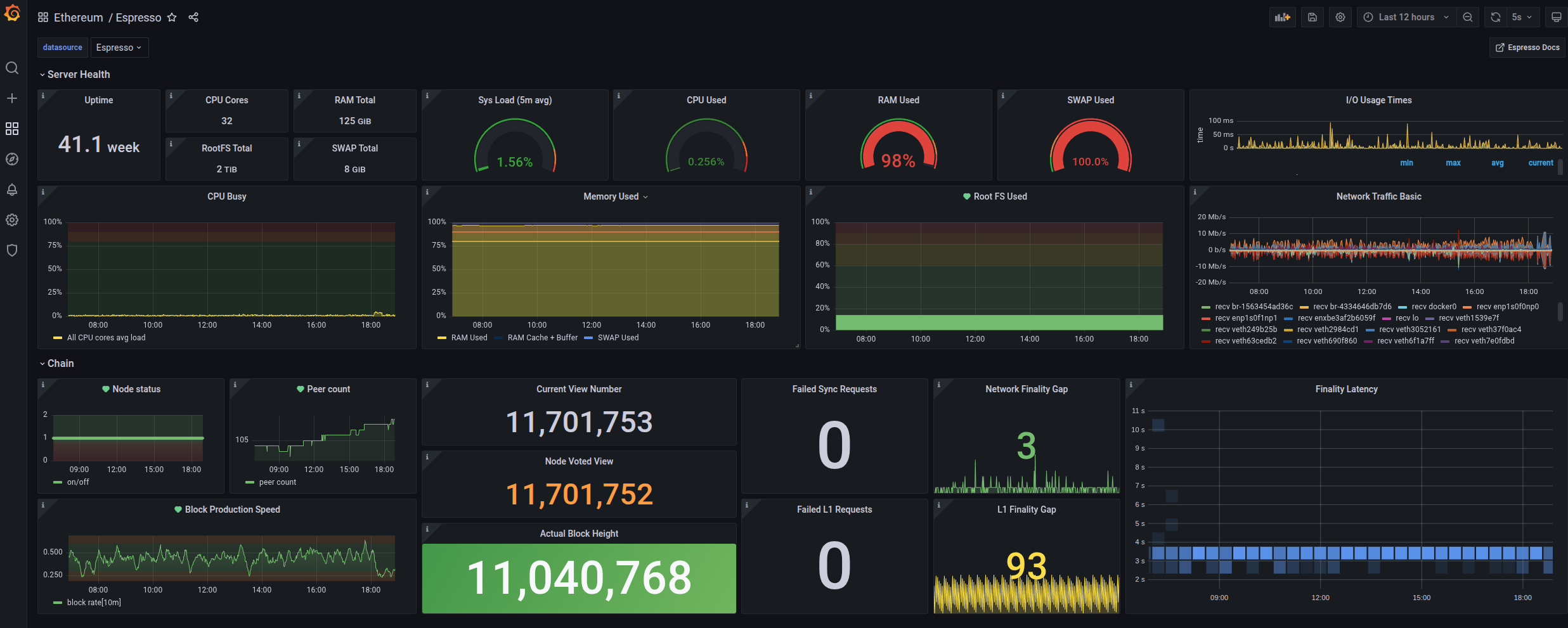 Dashboard uses Prometheus datasource to get the Espresso node metrics and NodeExporter for the HW metrics
