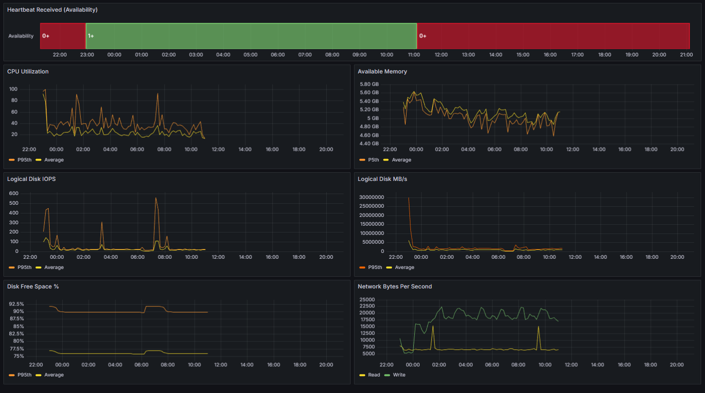 The Azure / Insights / Virtual Machine - Log Analytics dashboard uses the grafana-azure-monitor-datasource data source to create a Grafana dashboard with the state-timeline and timeseries panels.