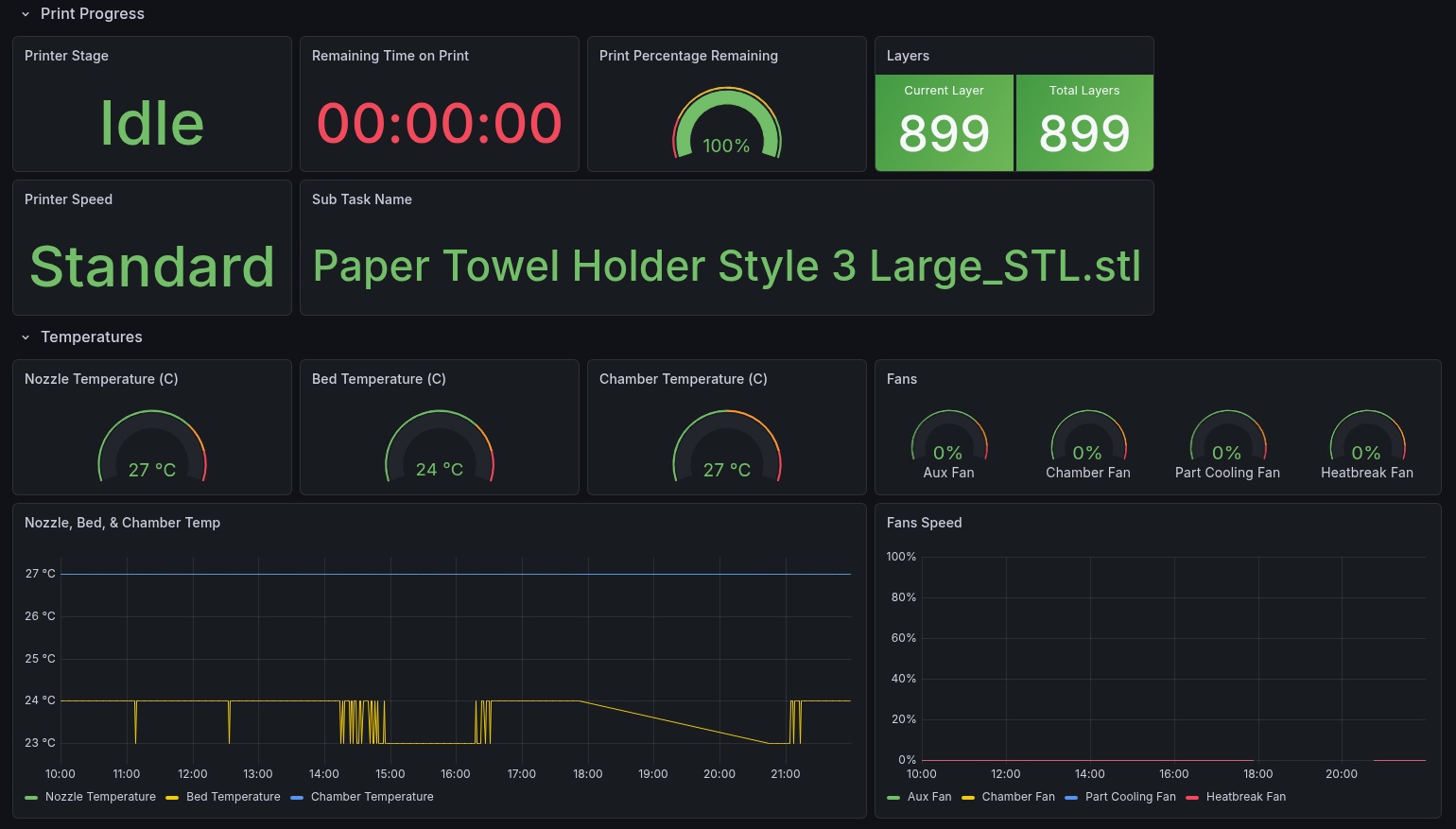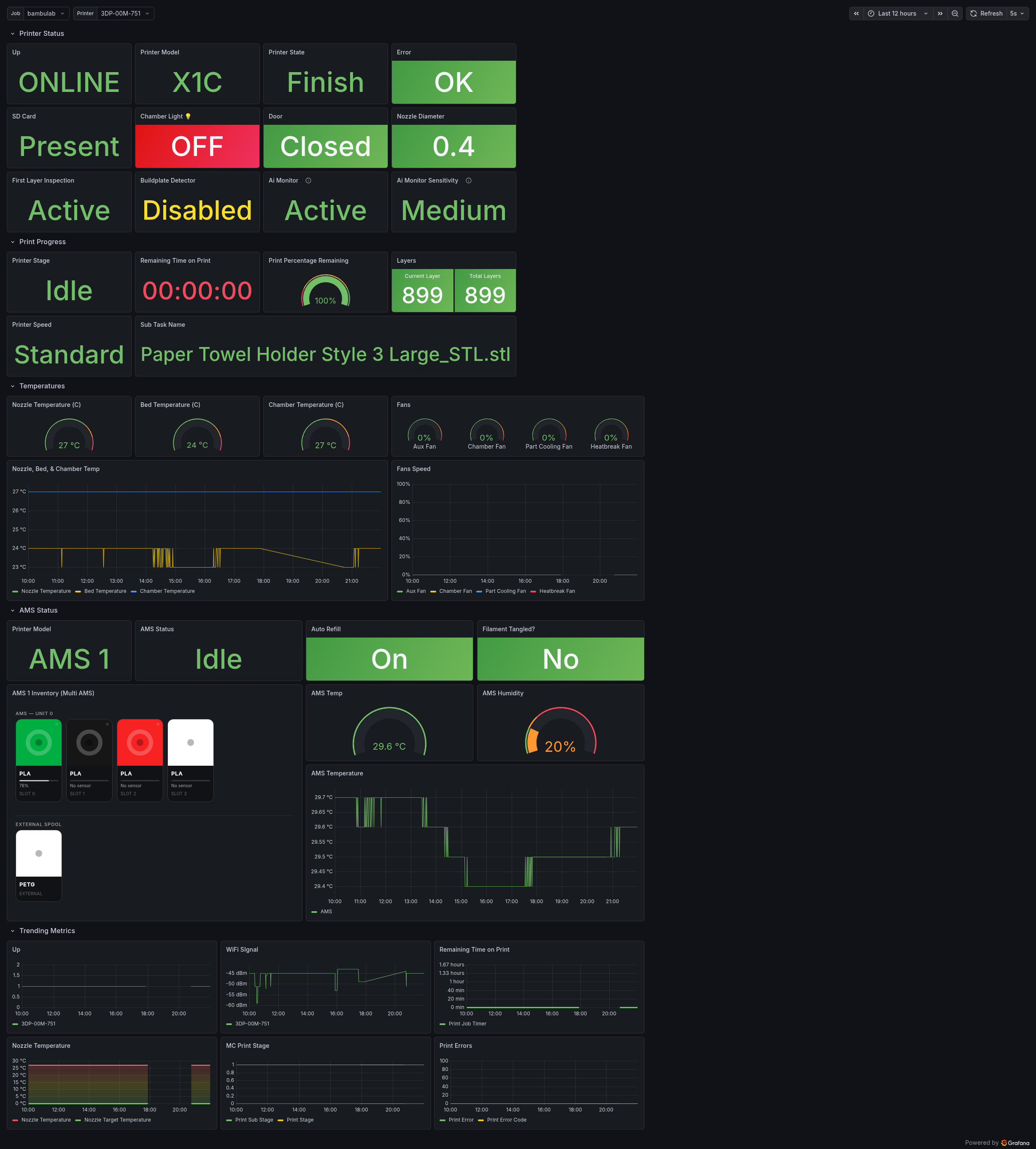 Real-time monitoring dashboard for BambuLab 3D printers. Tracks printer health, live print progress, temperatures, fan speeds, AMS filament inventory, and job queue status. Supports multiple printers and multiple AMS units automatically via Prometheus label-based discovery.