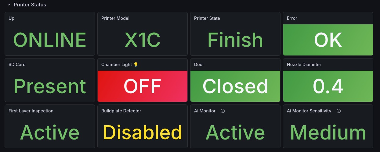 | Printer health | Stat | Shows polling status, MQTT connection, error flag, and SD card presence as green/red indicators |