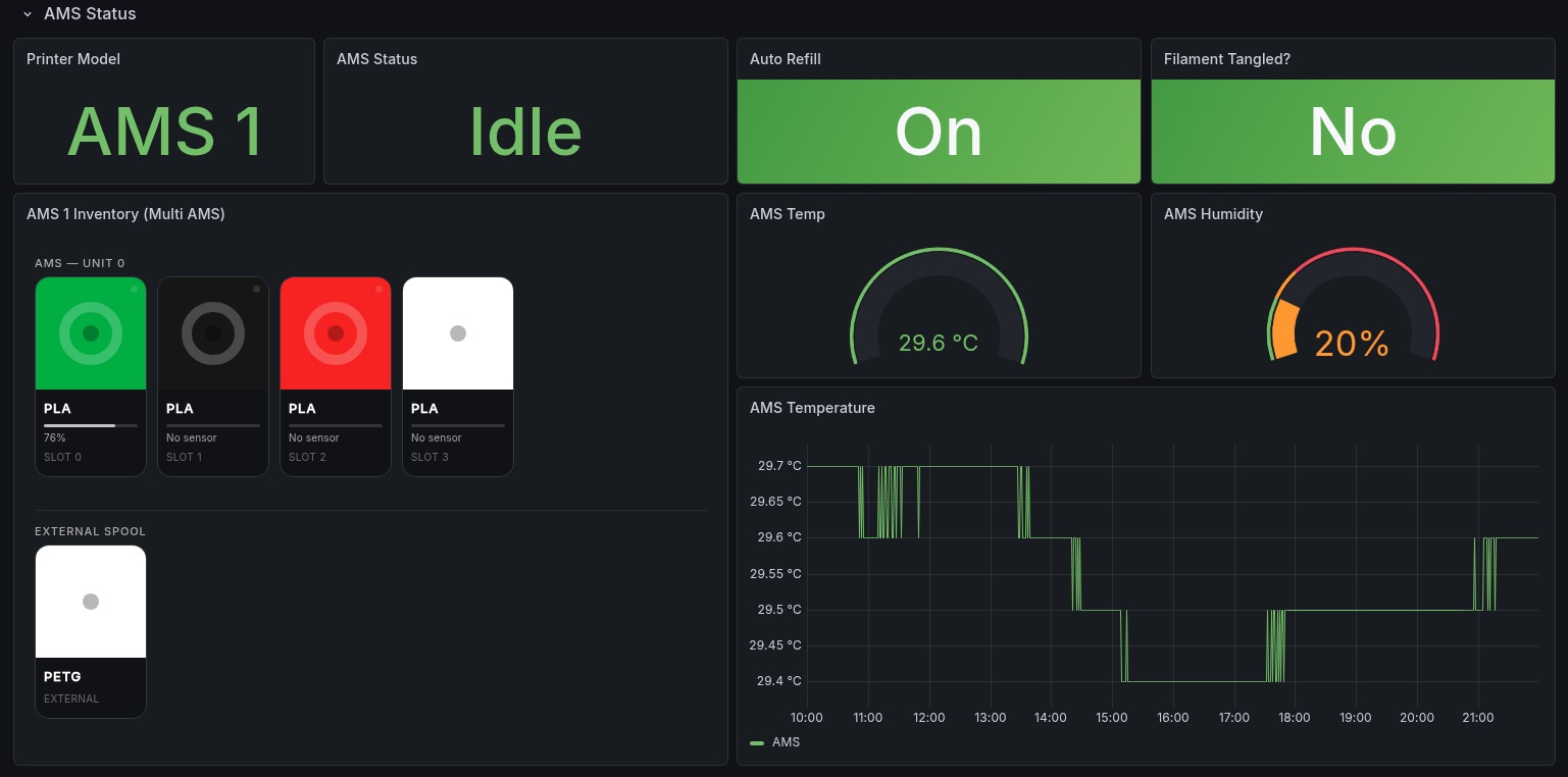 | AMS humidity & temperature | Stat + Time series | Per-AMS-unit humidity %, humidity index, and internal temperature |