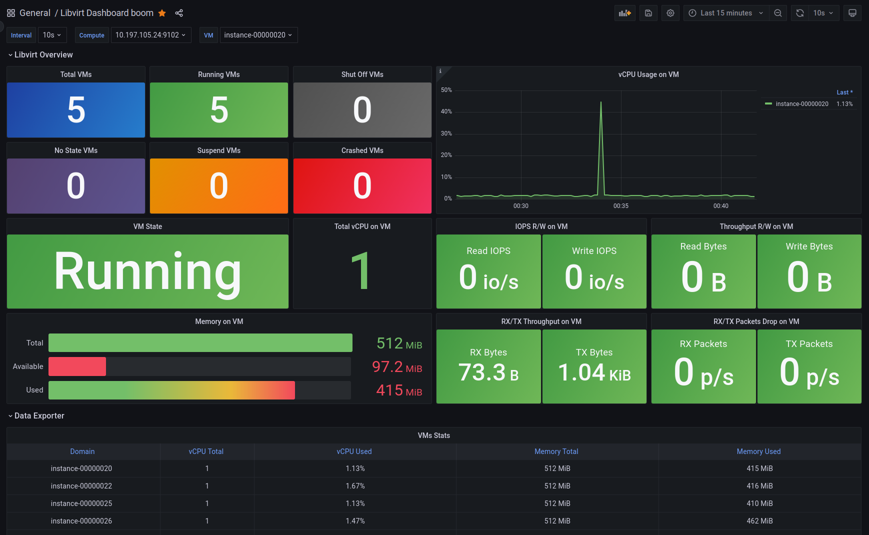 The Libvirt Dashboard boom dashboard uses the prometheus data source to create a Grafana dashboard with the bargauge, stat, table and timeseries panels.