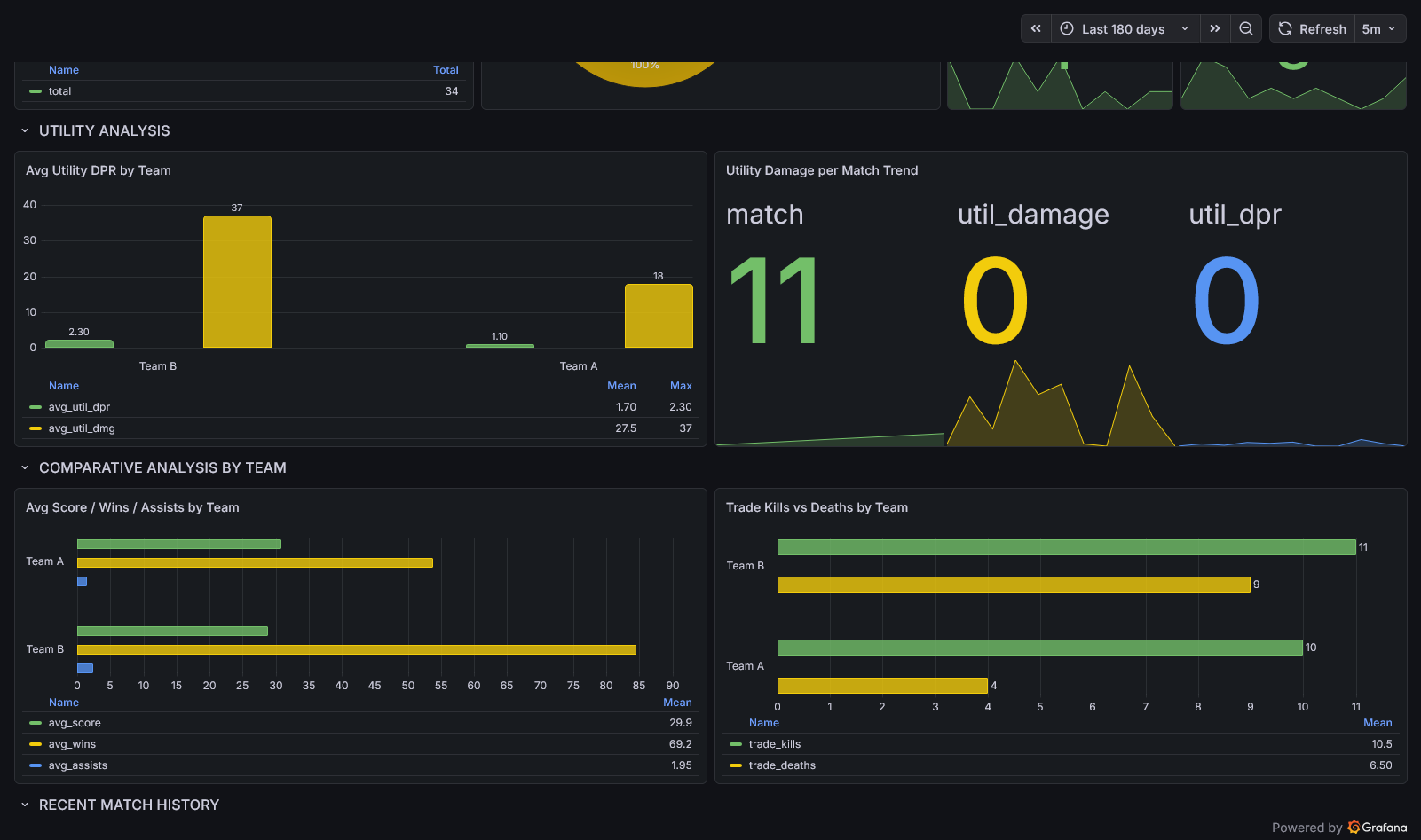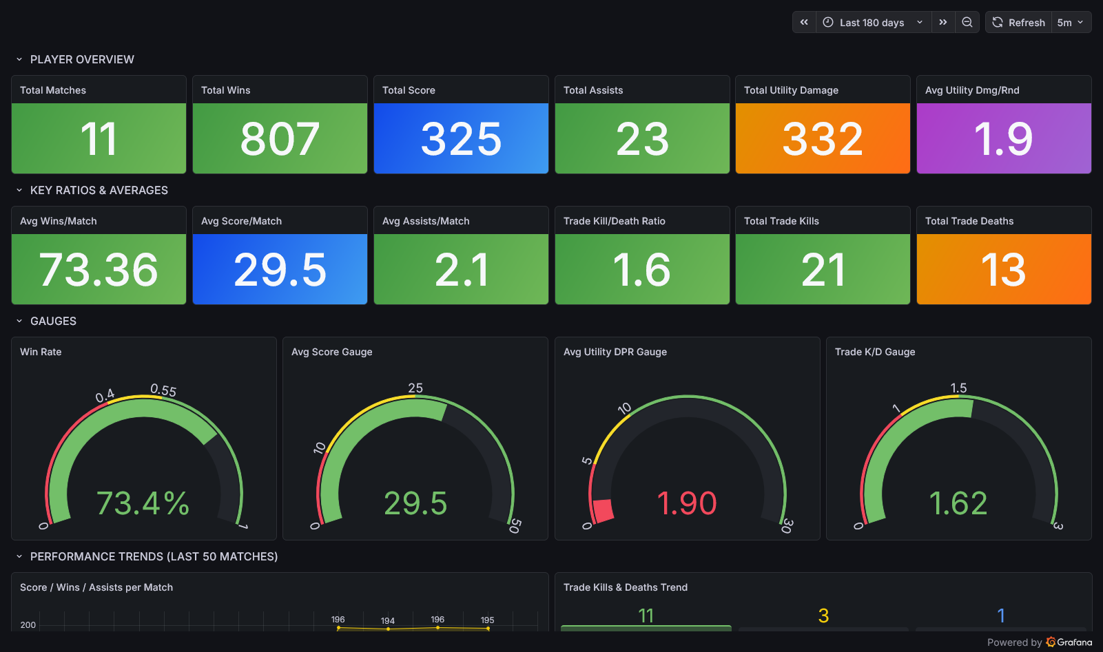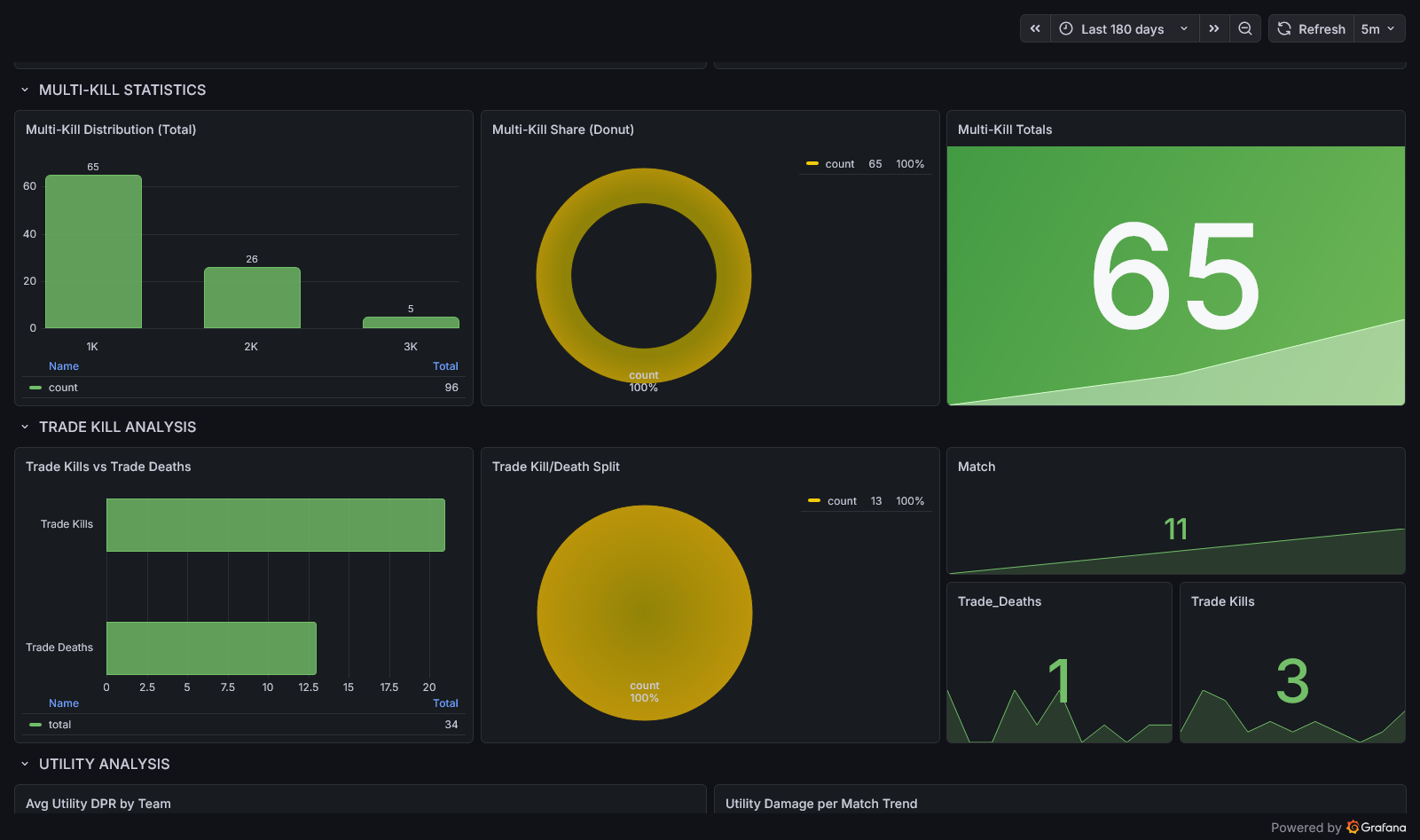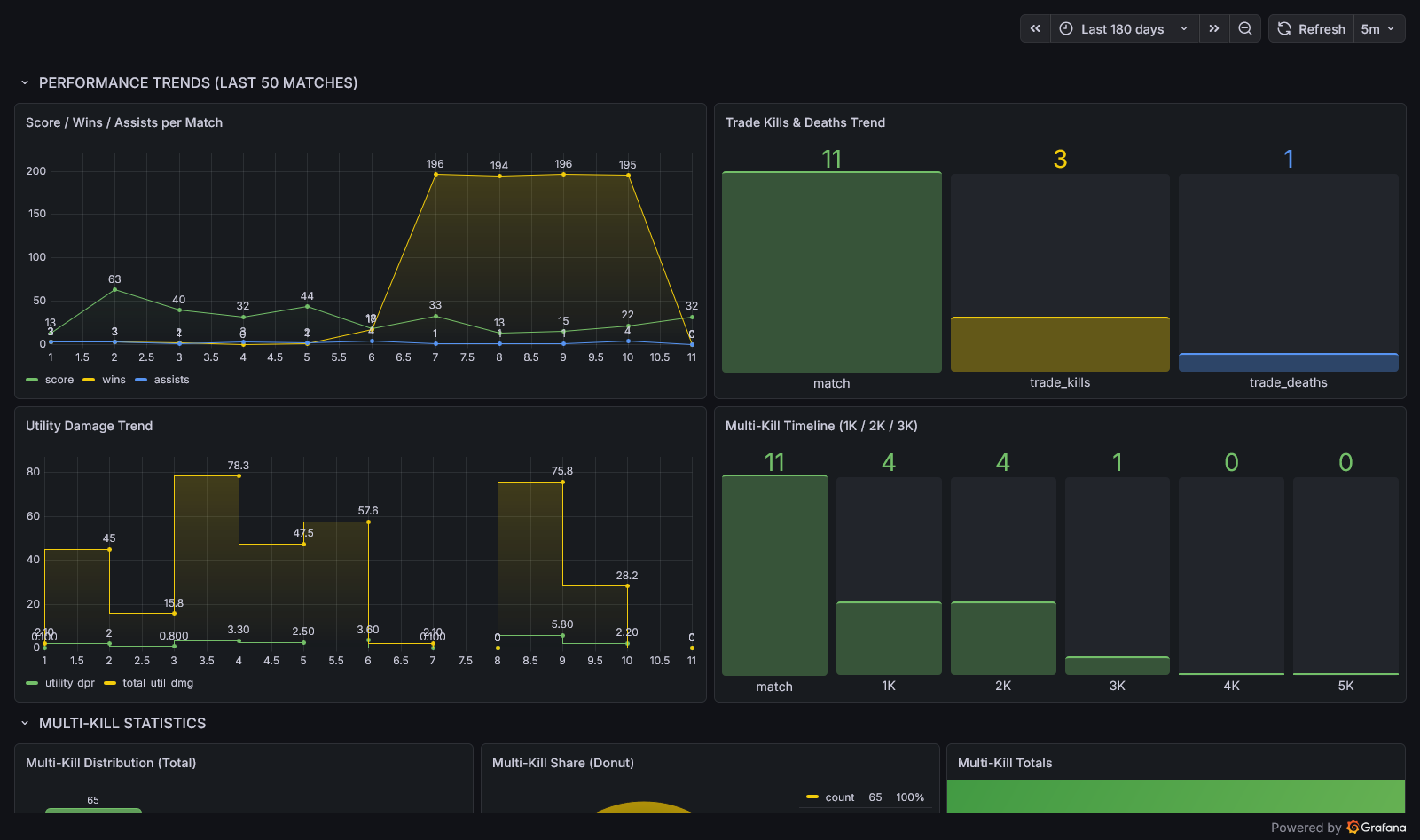 Dieses Grafana-Dashboard visualisiert detaillierte Counter-Strike-Spielerstatistiken auf Basis von CS Demo Manager (CSDM). Es richtet sich an Spieler und Analysten, die ihre Performance systematisch auswerten möchten.