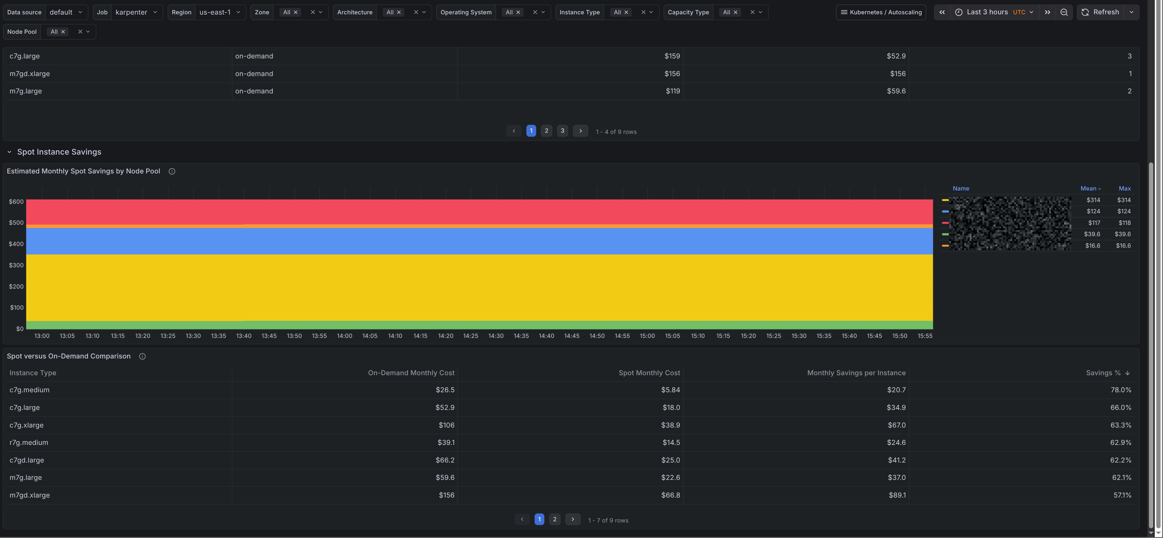 A dashboard that monitors current Karpenter node costs and spot savings based on cloud provider offering metrics. These values are estimated instance prices, not billing data. For deeper cost analysis, deploy OpenCost (https://github.com/opencost/opencost) and opencost-mixin (https://github.com/adinhodovic/opencost-mixin/). The dashboards were generated using [kubernetes-autoscaling-mixin](https://github.com/adinhodovic/kubernetes-autoscaling-mixin). Open issues and create feature requests in the repository.