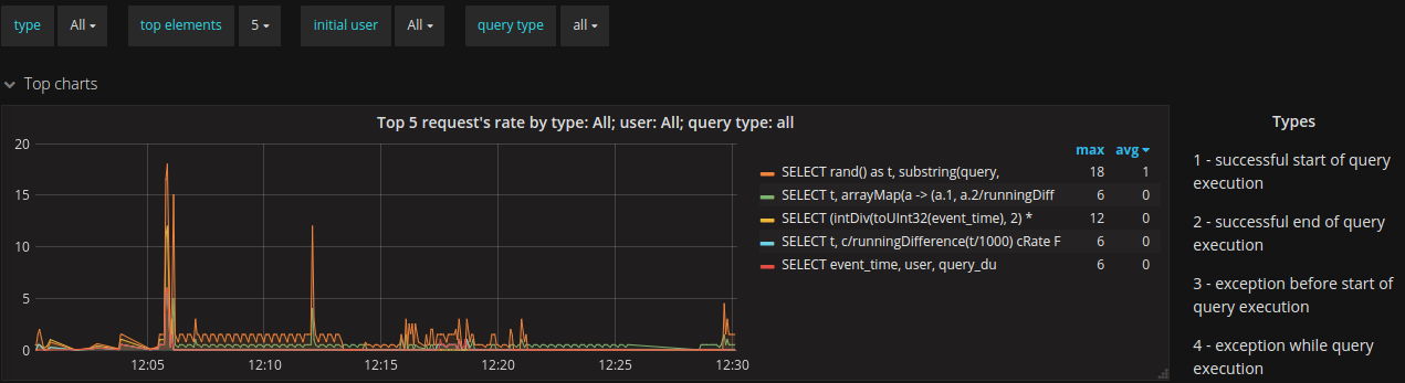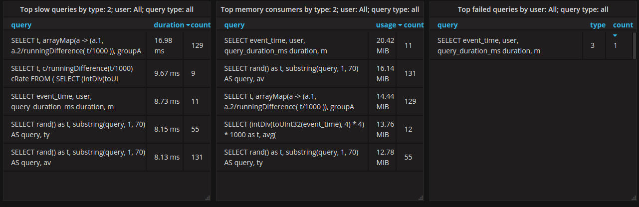 Helps to visualize most frequent, slowest, failed queries. Shows queries rate per second, table with last queries