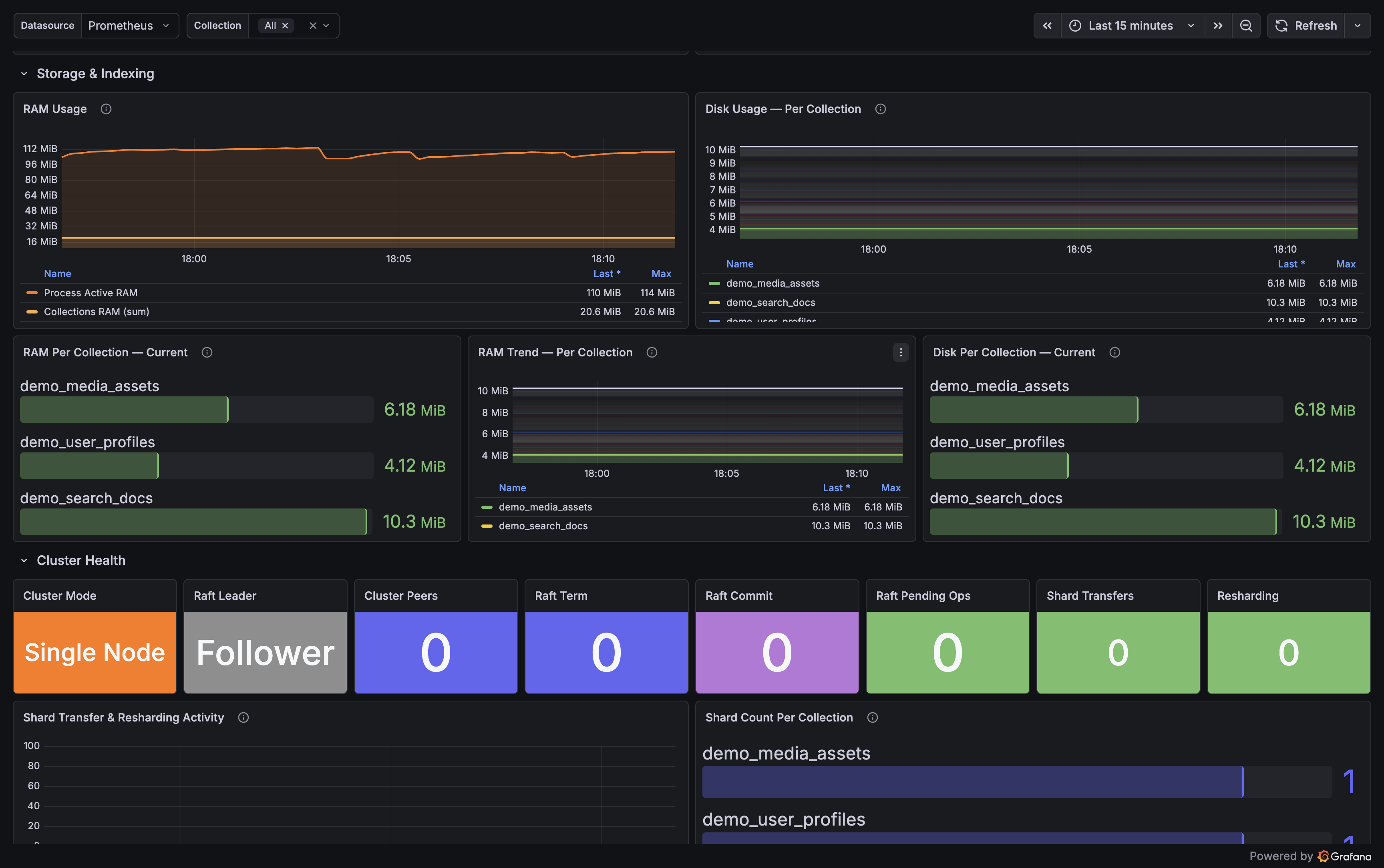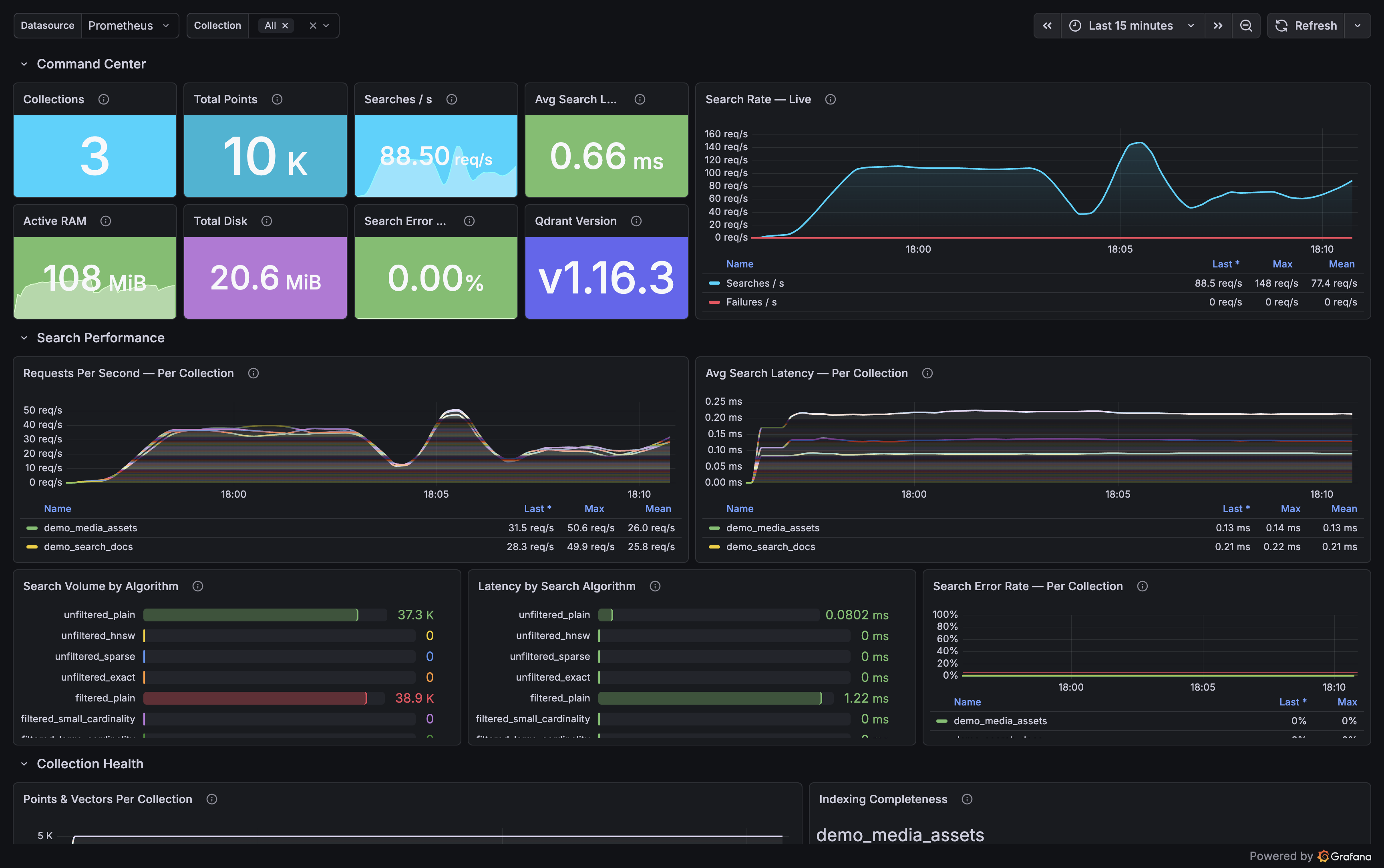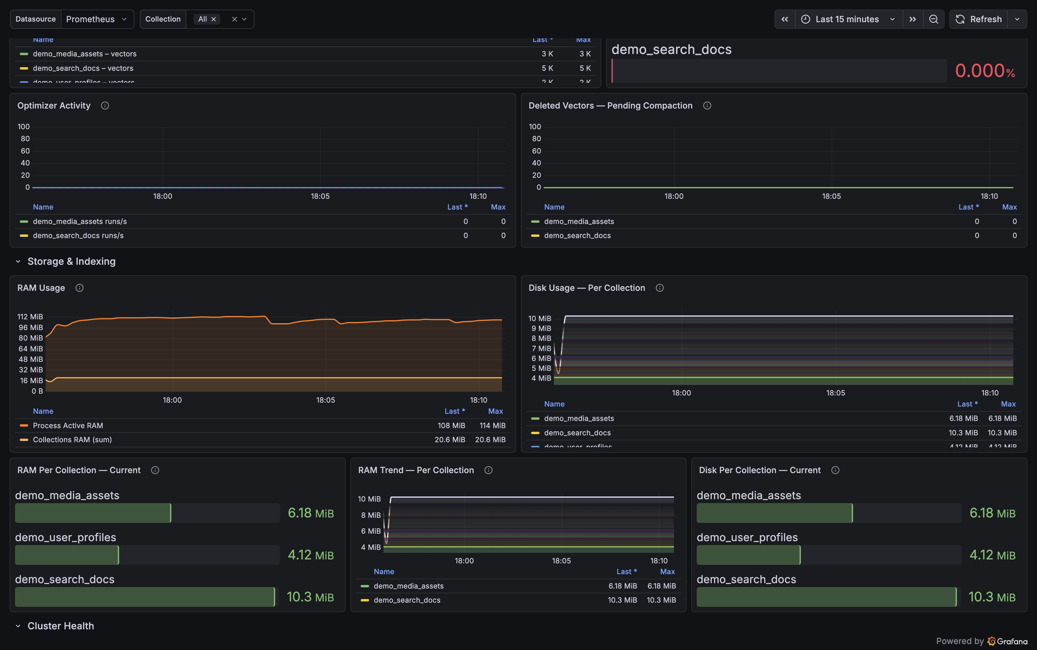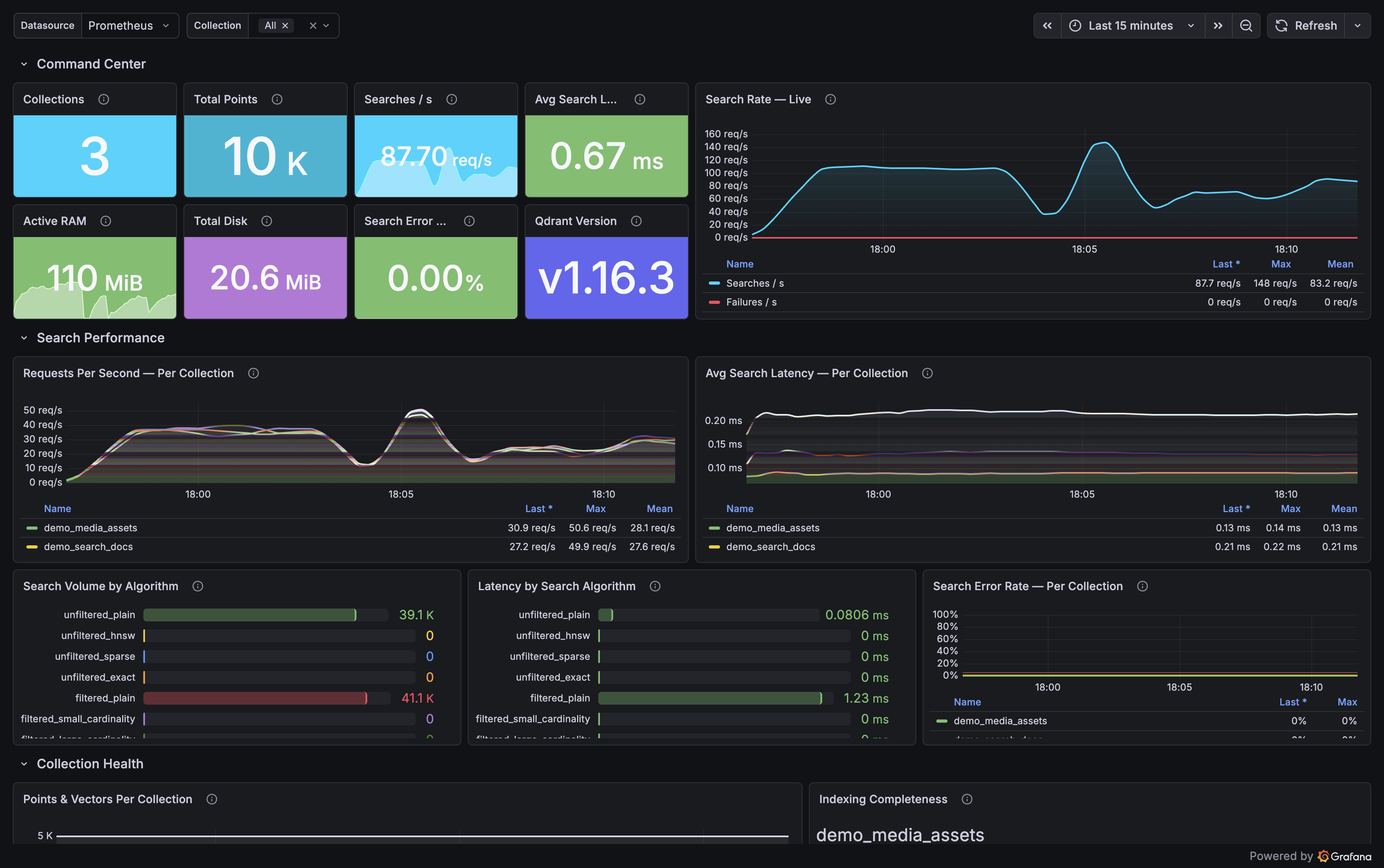 | Collections | Per-collection vector counts, indexed ratio, shard states, optimizer status |