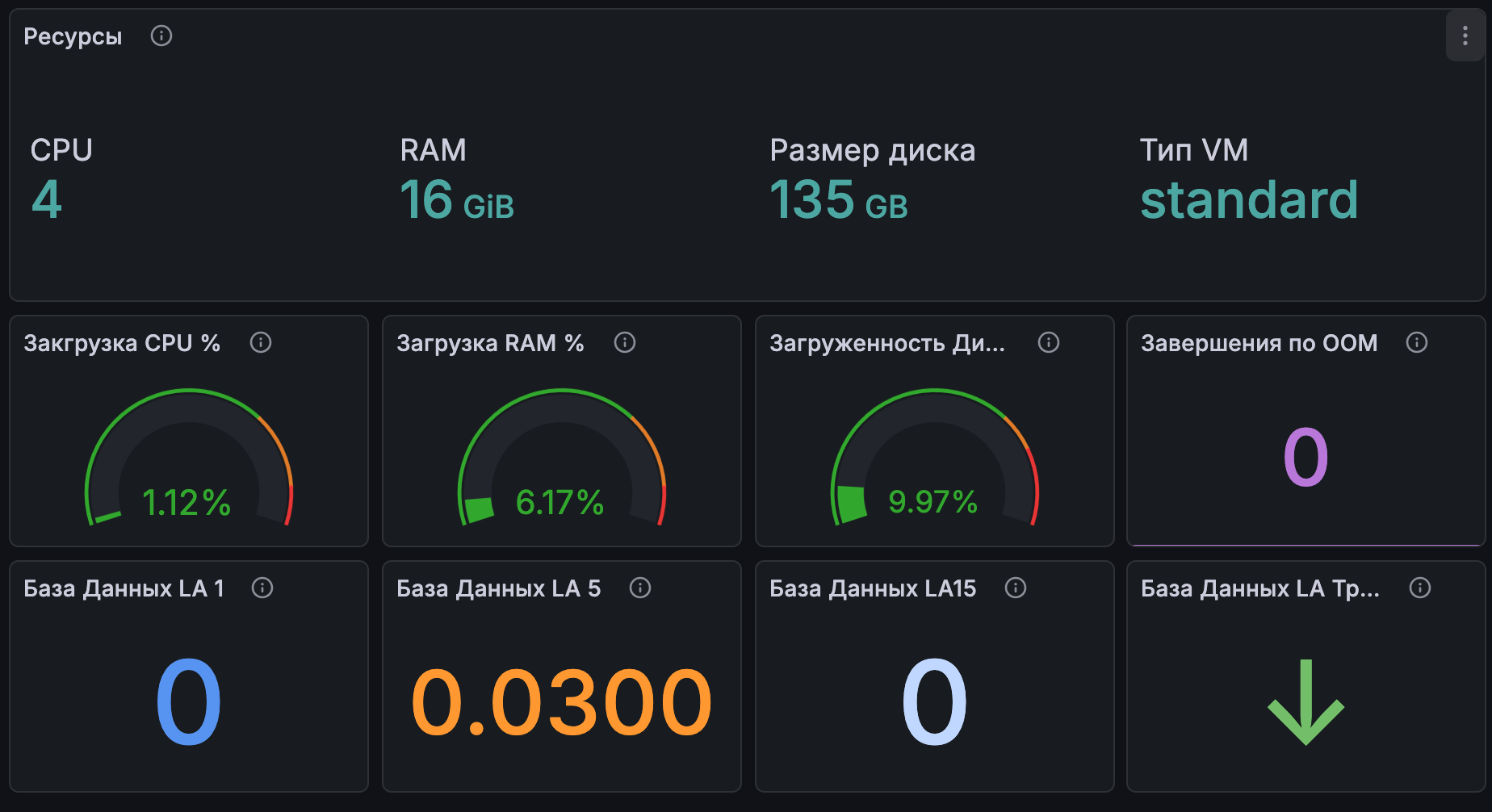 Дашборд предназначен для мониторинга Баз Данных в кластерах 1С, развернутых в Готовом Облаке 1С Selectel. Обеспечивает Возможность отслеживать основные показатели производительности БД.