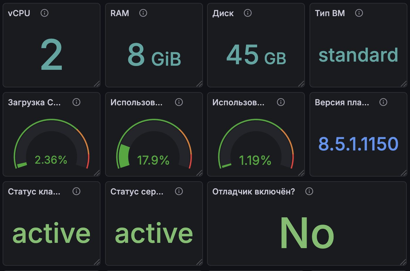 Дашборд предназначен для мониторинга кластеров 1С, развернутых в Готовом Облаке 1С Selectel. Объединяет метрики уровня кластера, процессов и инфраструктуры в едином интерфейсе.