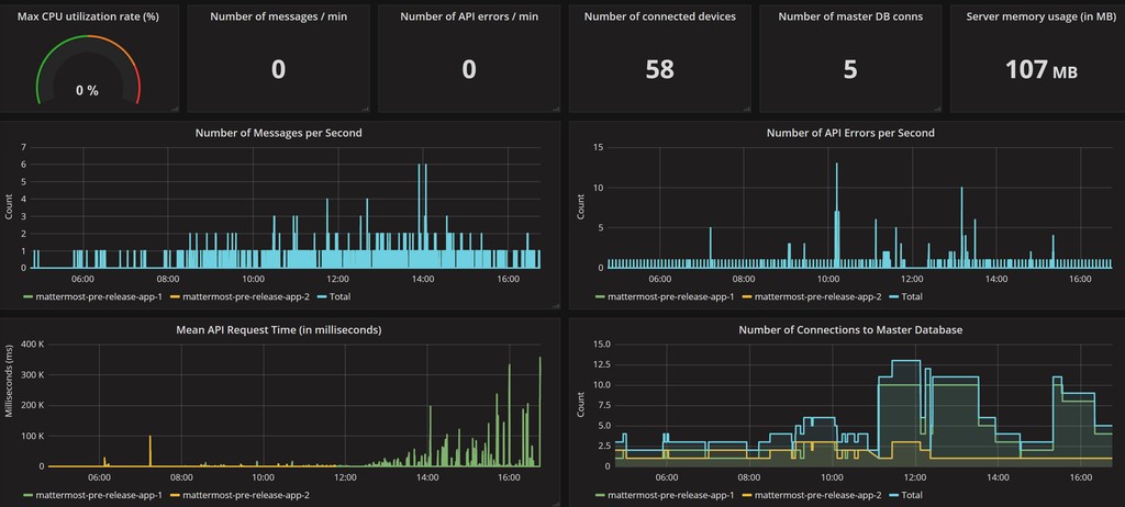 Performance monitoring support enables a Mattermost server to track system health for large Enterprise deployments through integrations with Prometheus and Grafana.