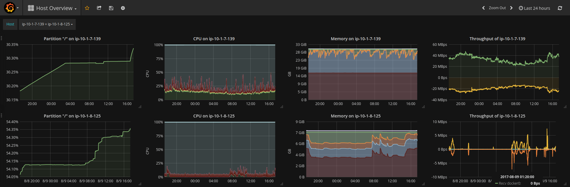 The Host Overview dashboard uses the influxdb data source to create a Grafana dashboard with the graph panel.