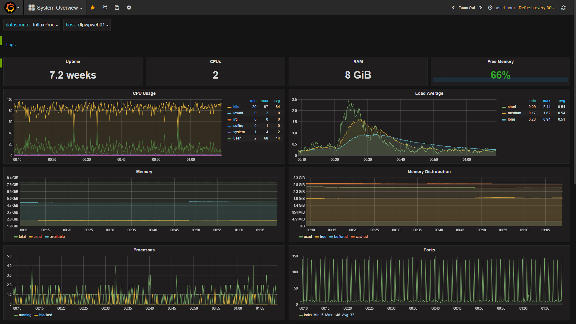 This Dashboard provides a general overview of a system, with templating to select the datasource and host.