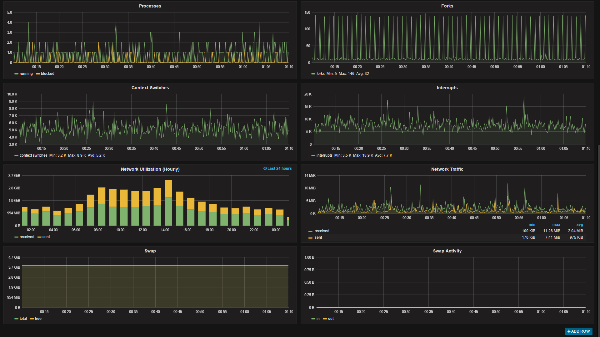 Panels for CPU usage, load, memory use and distribution, processes, forks, context switches and interrupts. Realtime and hourly summary of network bandwidth utiliization, and swap space utilization and activity.