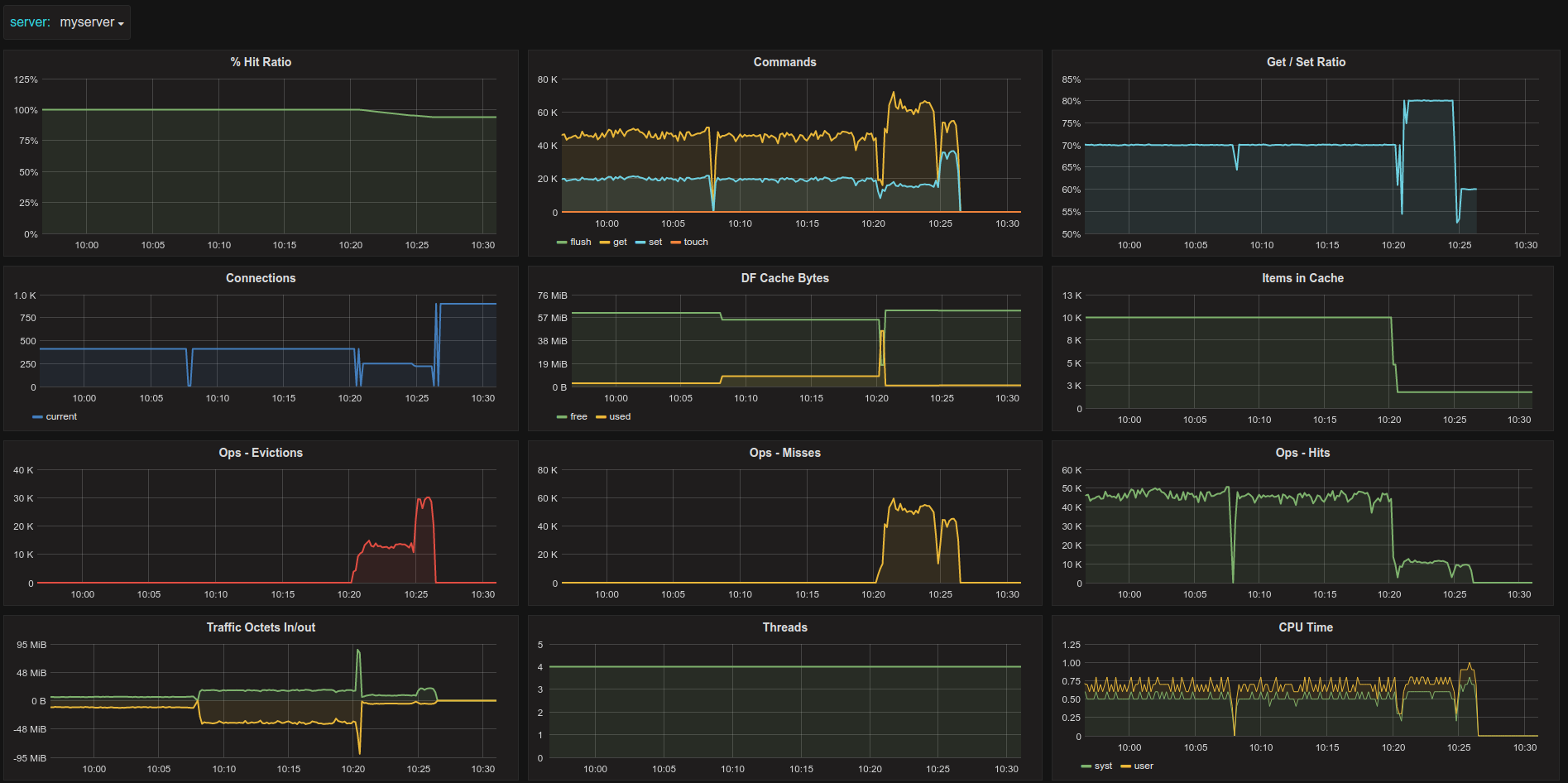 - Connections, DF Cache Bytes (free/used), Items In Cache
