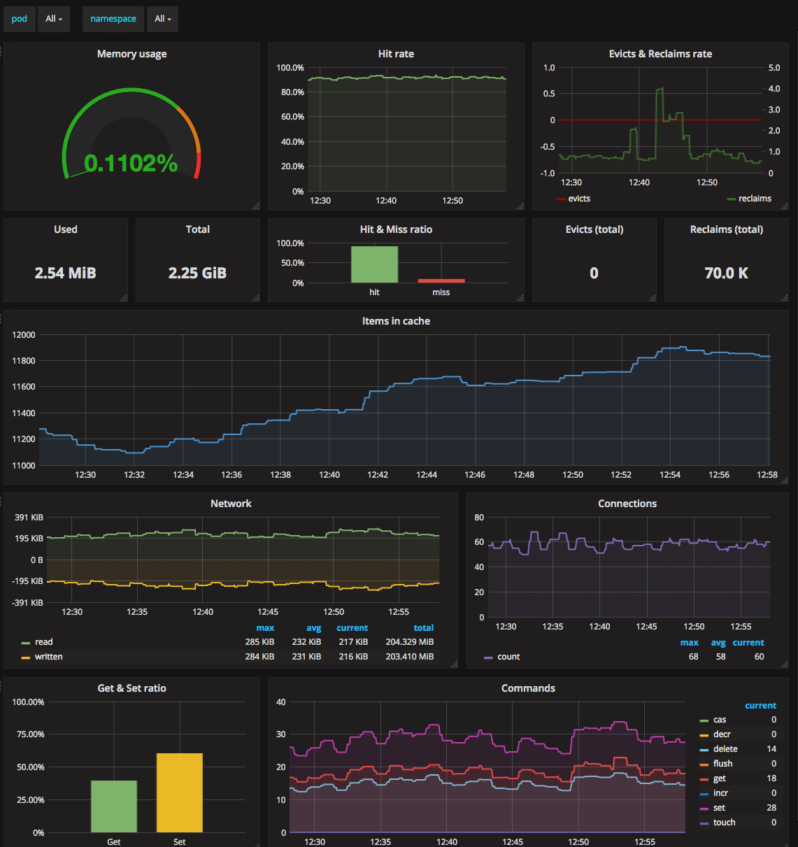 Monitors Kubernetes Memcached Pods. Shows memory usage, hit rate, evicts and reclaims rate, items in cache, network stats, commands rate. Requires Memcached Exporter for Prometheus.