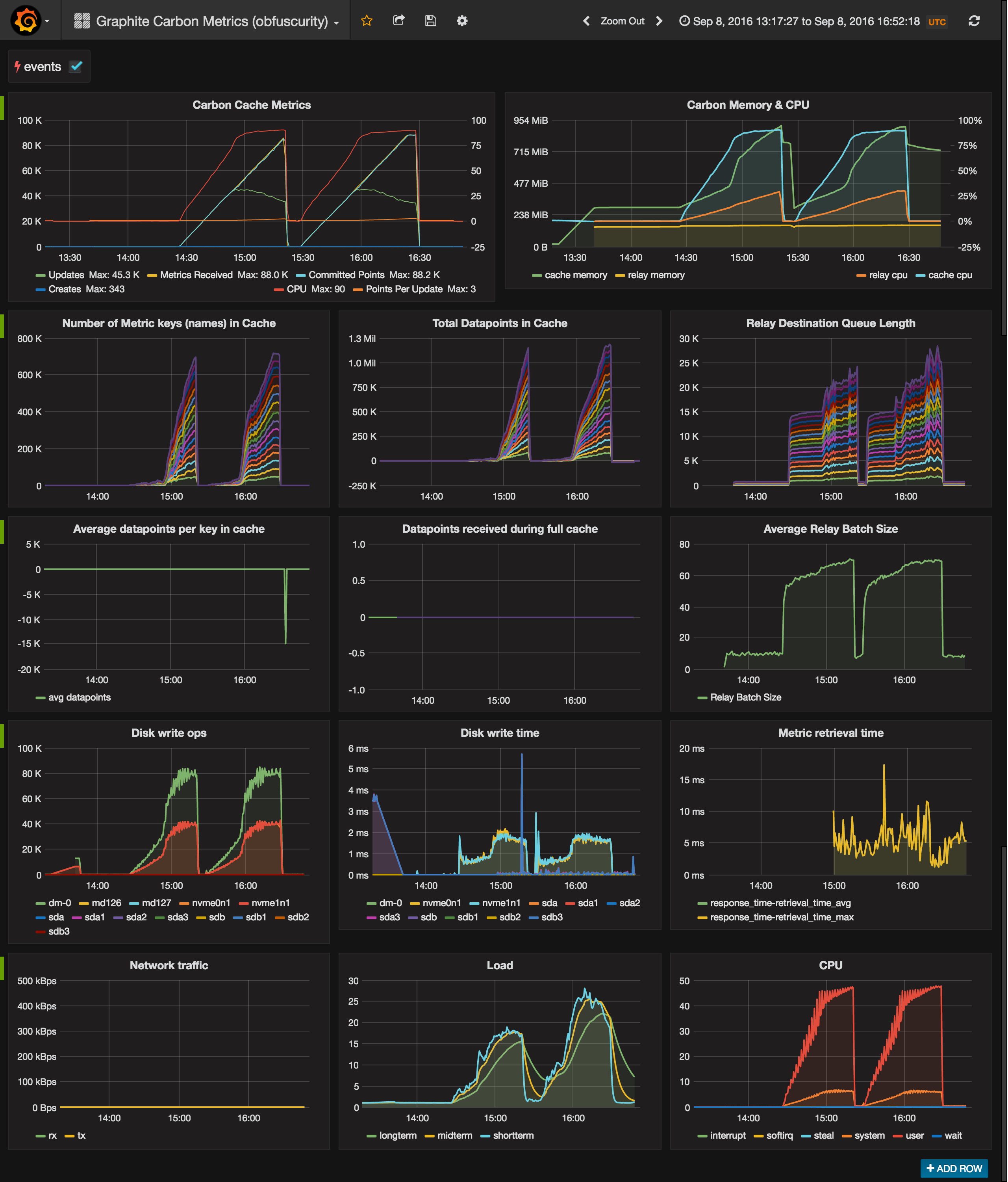This is a more exhaustive take on the original Graphite Carbon Metrics dashboard. Aside from some minor metric fixes, it adds new panels for memory footprint and cache details (keys & datapoints in cache, avg number of datapoints per key, etc).