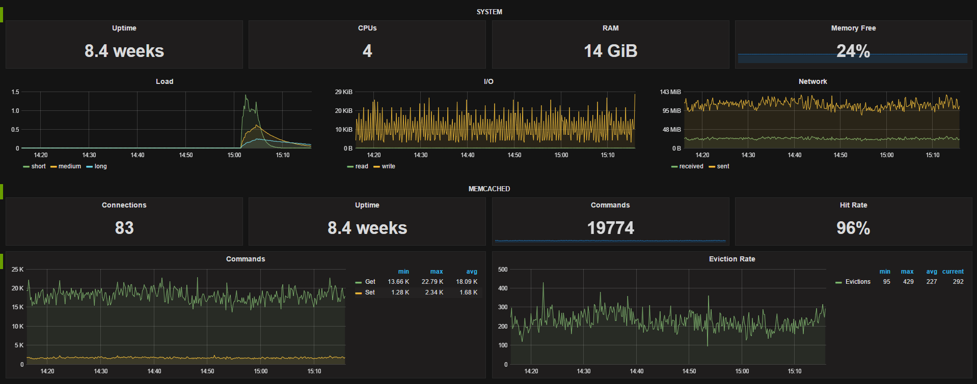 System stats for uptime, cpu count, RAM, free memory %, and panels for load, I/O and network traffic. MemcacheD single stats for connections, uptime, commands and hit rate, along with panels for commands and eviction rate.