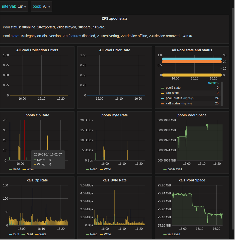 Metrics displayed include zpool status and state, errors, op/byte rate, and space available.