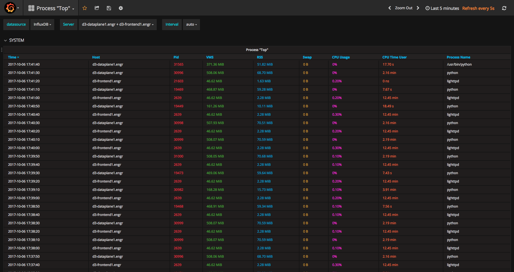 Mimic "top" Linux command - view processes and their system resource usage. Datasource: InfluxDB; Collector: Telegraf