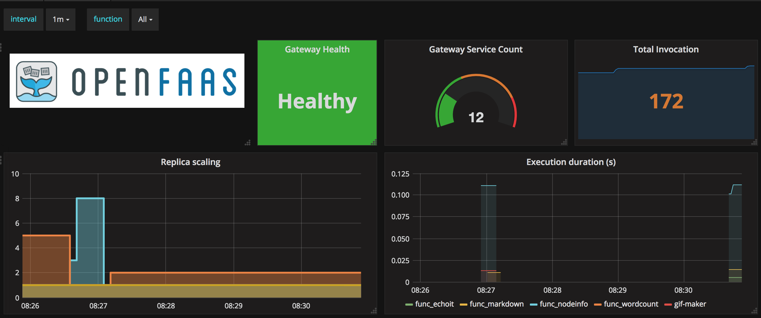 OpenFaaS (Functions as a Service) is a framework for building serverless functions with Docker which has first class support for metrics. These metrics are scraped by Prometheus and visually represented in Grafana. The entire OpenFaaS framework can be launched in less the 60 seconds which includes the monitoring capability.