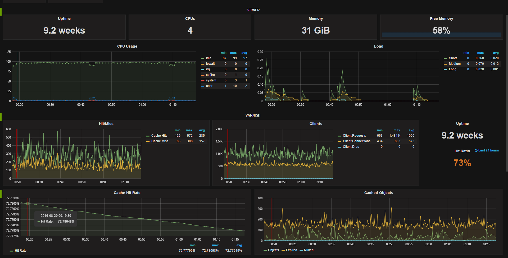 Varnish metrics include: Cache Hit/Miss, client status, uptime, hit rate (24 hours) single stat, hit rate, cached objects, threads, backend status.