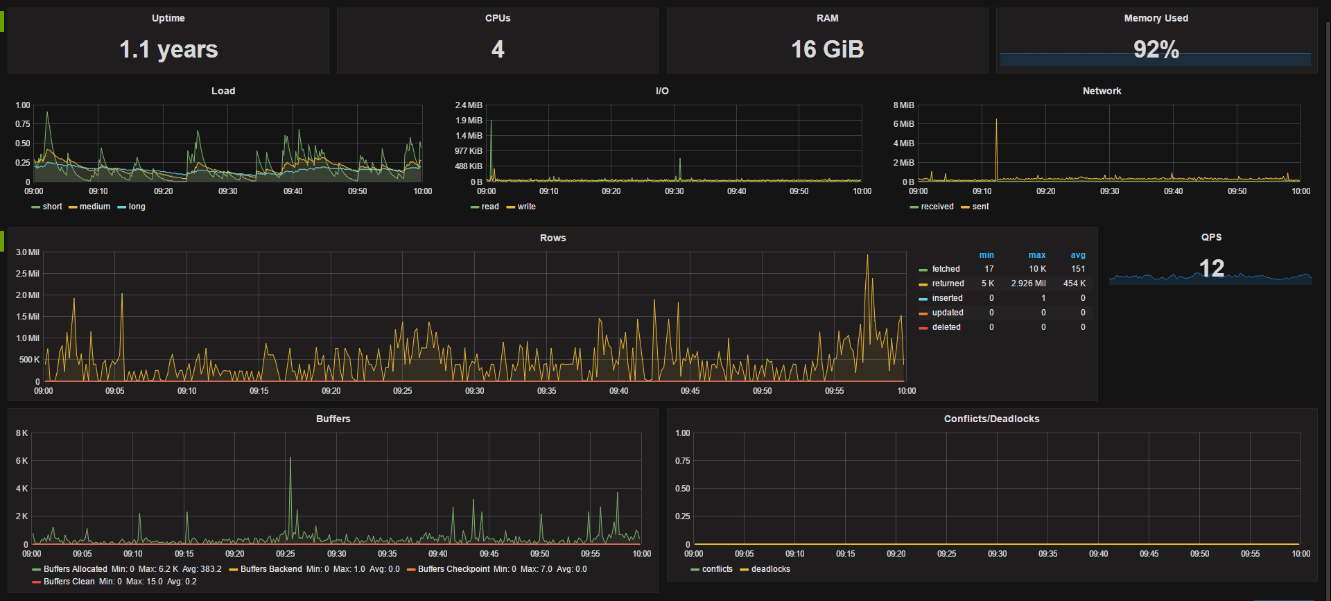 Postgres metrics include: Rows returned, single stat for queries per second (QPS), buffers, and conflicts and deadlocks.