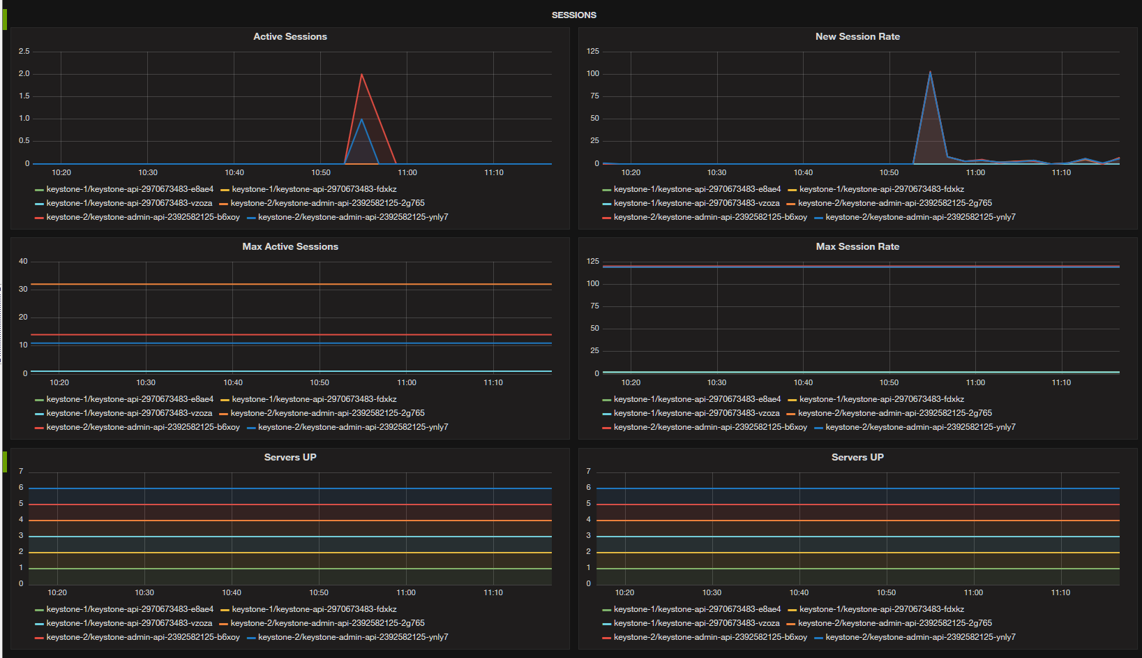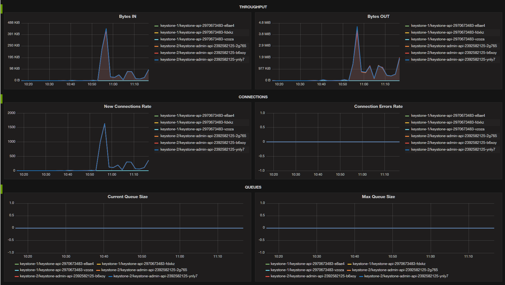 This dashboard displays the detailed number of responses and their split by HTTP codes along aggregated throughput for the haproxy backend servers.