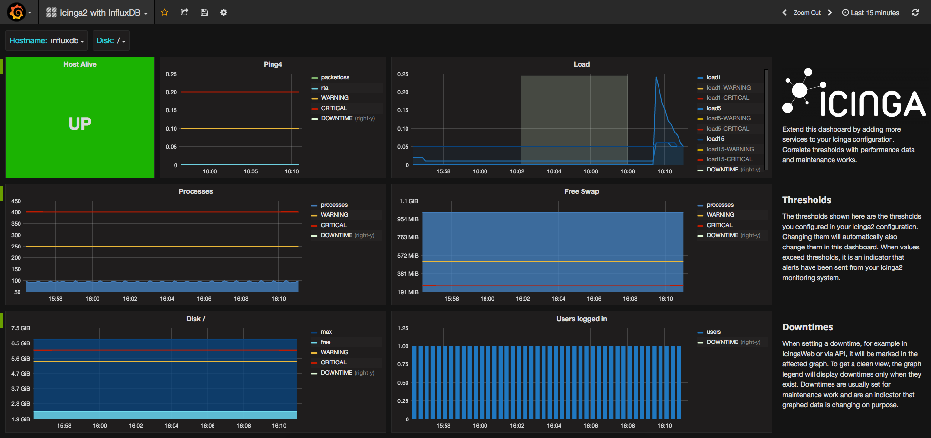 This dashboard can be used with a default icinga2 installation. It will show different states about a host and its services. Including UP/DOWN state, load, disk space, process count and more. The intention of the dashboard is to be extended as your icinga2 configuration grows. It includes special values like thresholds and downtimes.