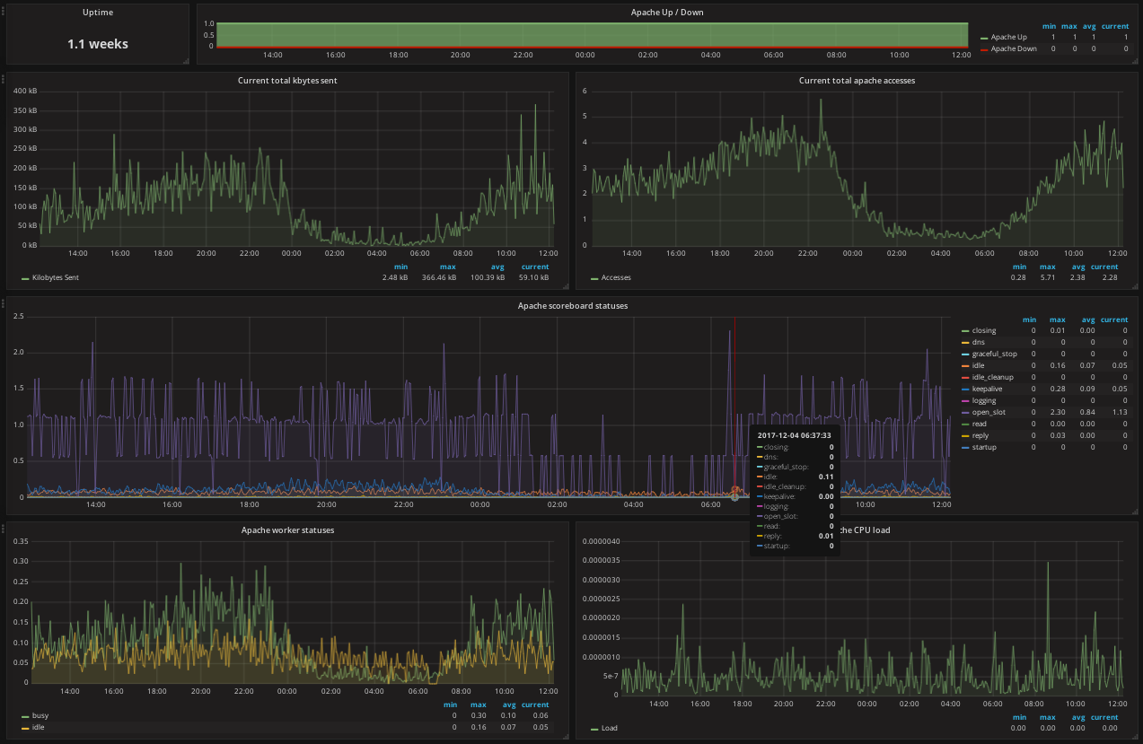 Nearly all values exported by Prometheus Apache exporter graphed.