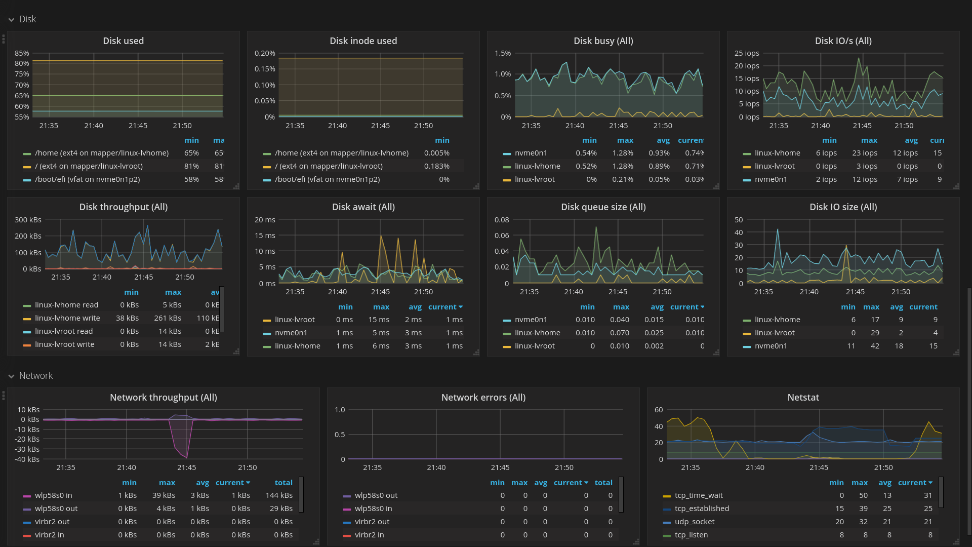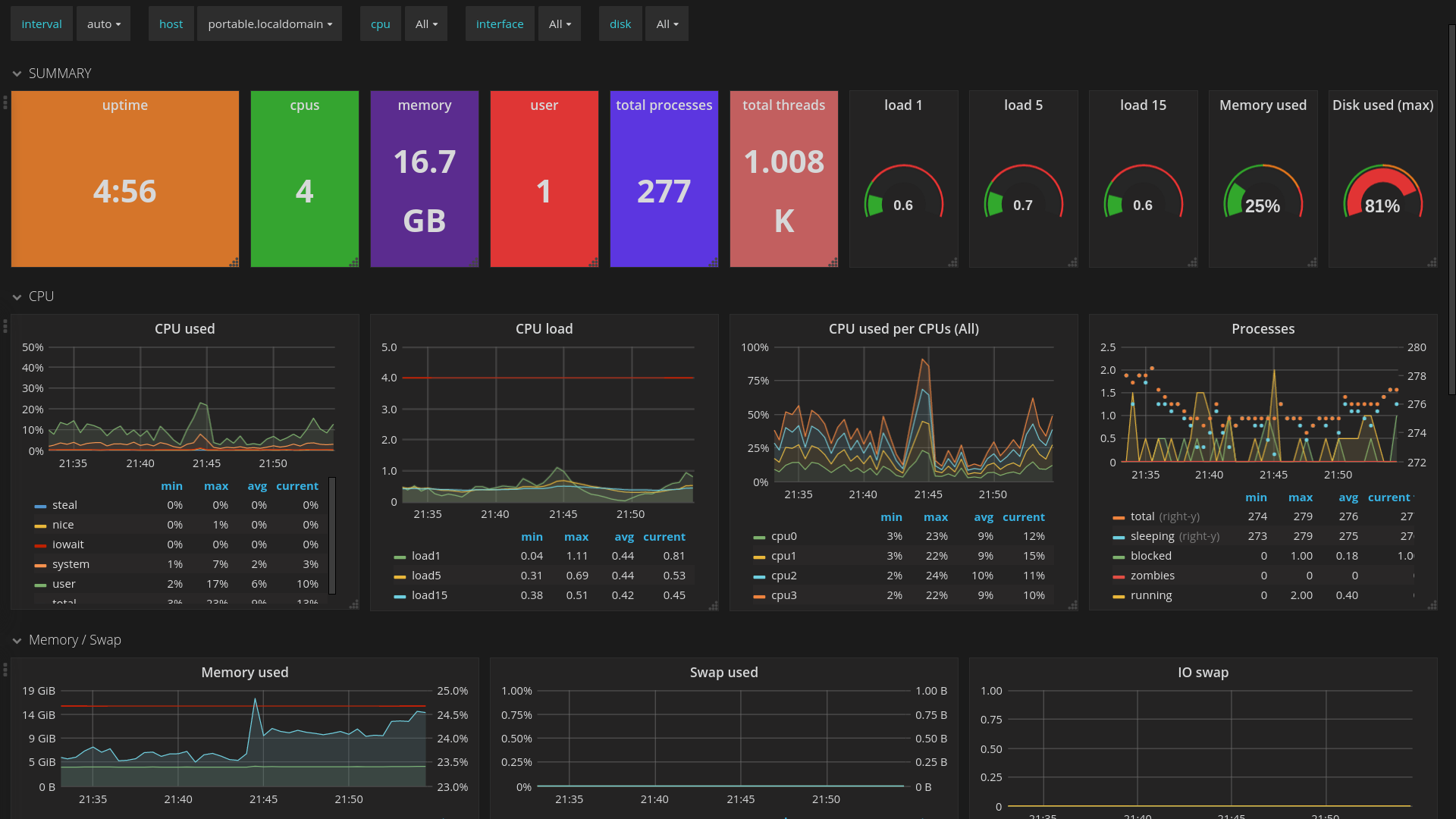 The System dashboard uses the influxdb data source to create a Grafana dashboard with the graph and singlestat panels.