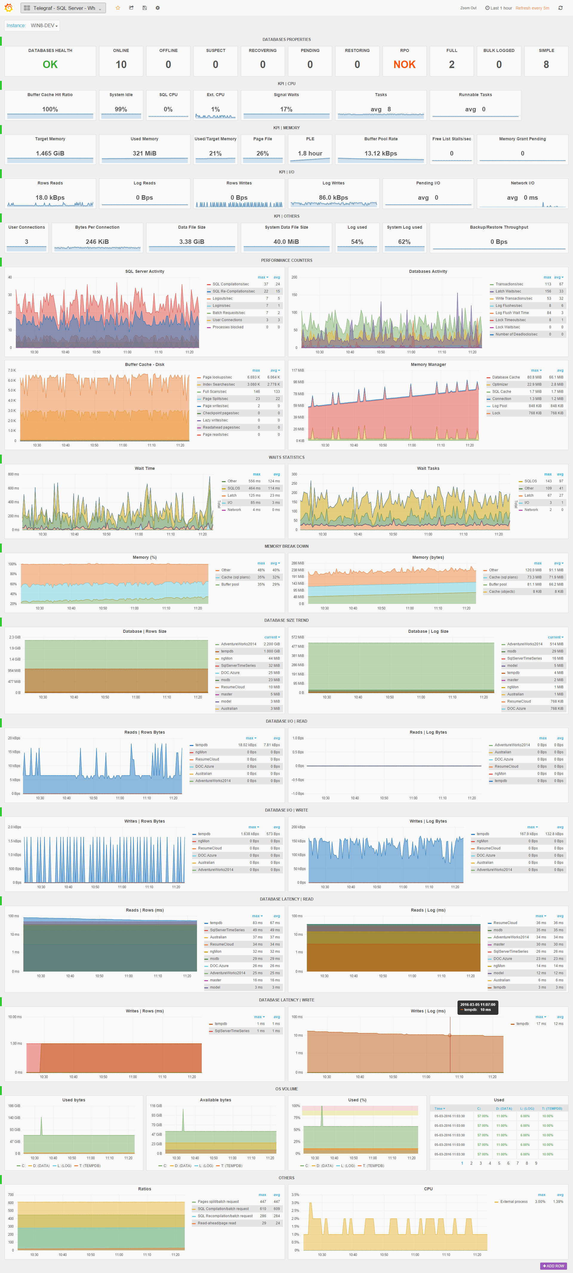 The dashboard provides KPIs and graphs for metrics collected in real-time by the Telegraf agent and stored in InfluxDB: