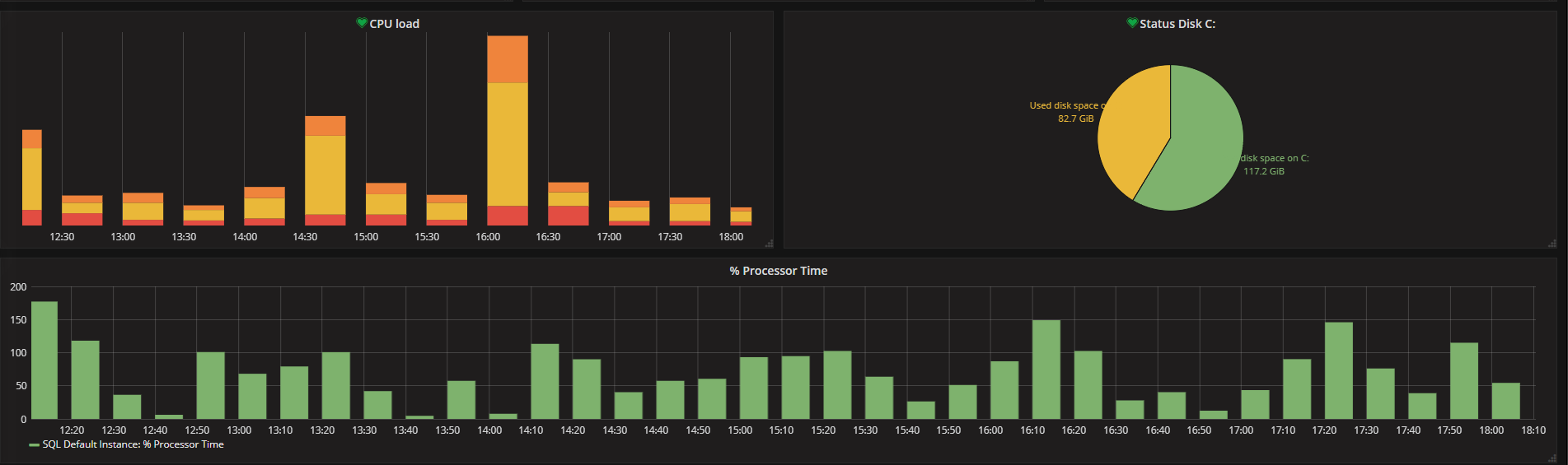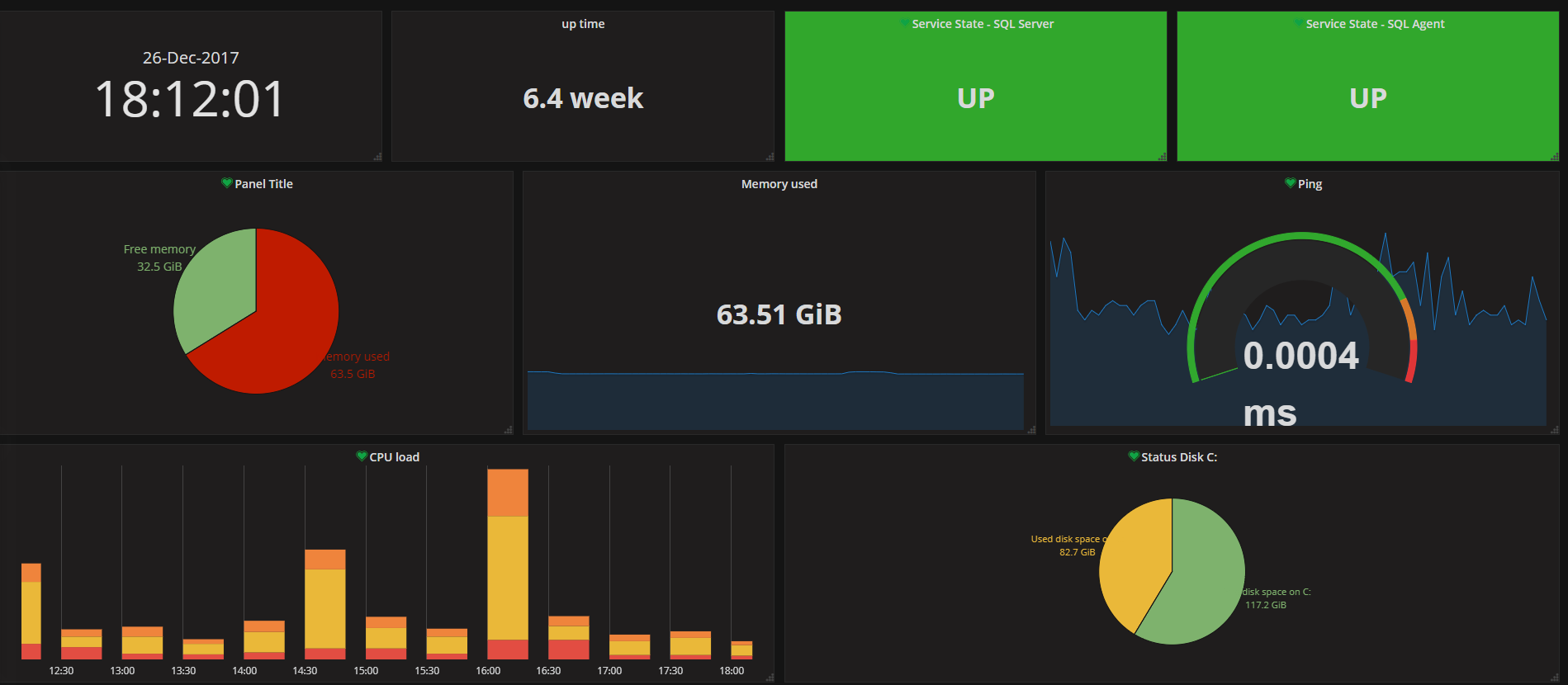 The Basic Information with MSSQL dashboard uses the alexanderzobnin-zabbix-datasource data source to create a Grafana dashboard with the grafana-clock-panel, grafana-piechart-panel, graph and singlestat panels.