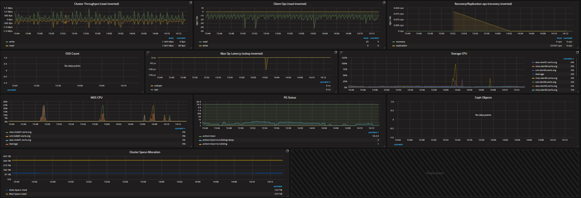 This dashboard shows information about the Ceph cluster operations. In addition to the Ceph plugin, the Ceph mgr python plugin influx is also required to display the majority of the graphs shown in the snapshot.
