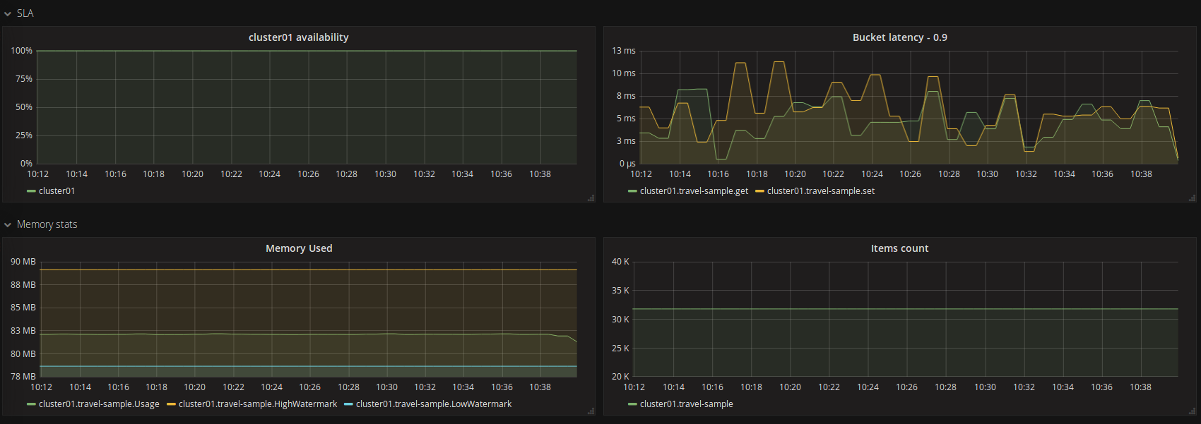 Couchbase dashboard based on prometheus metrics exported by our Couchbase Java probe mewpoke (https://github.com/criteo/mewpoke). Full Docker environment available for tests: https://github.com/criteo/mewpoke/tree/master/tests