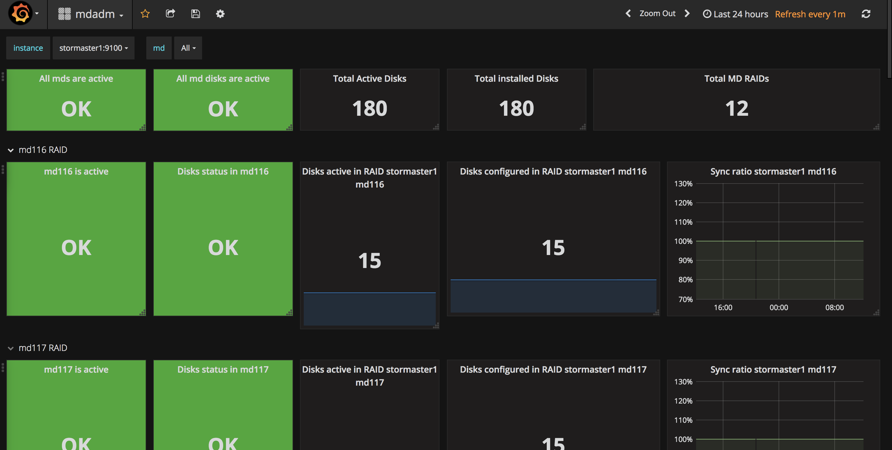This dashboard is for the prometheus/node_exporter mdadm module. It shows: