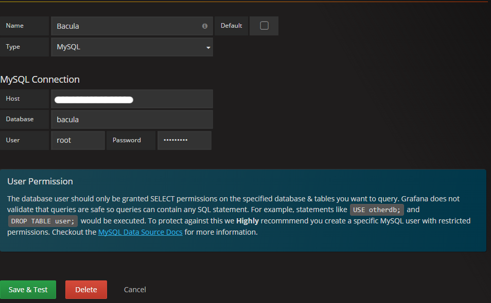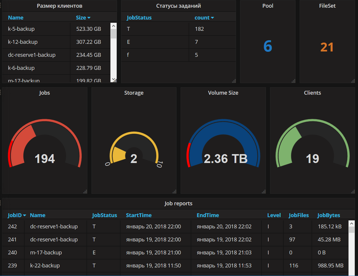 The Bacula dashboard uses the mysql data source to create a Grafana dashboard with the singlestat and table panels.