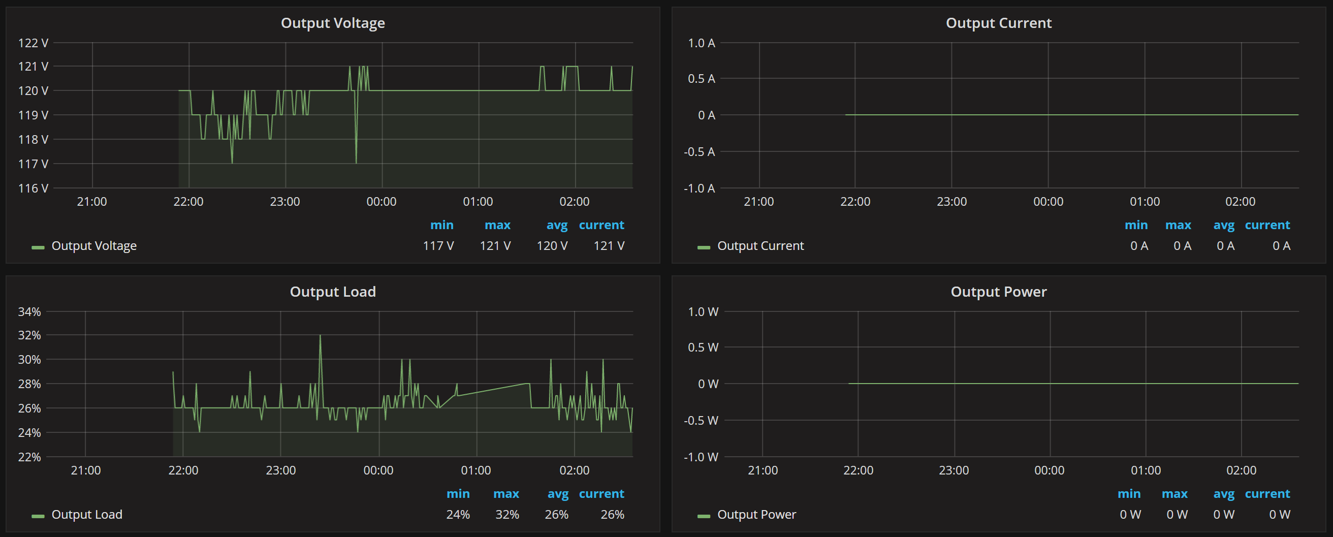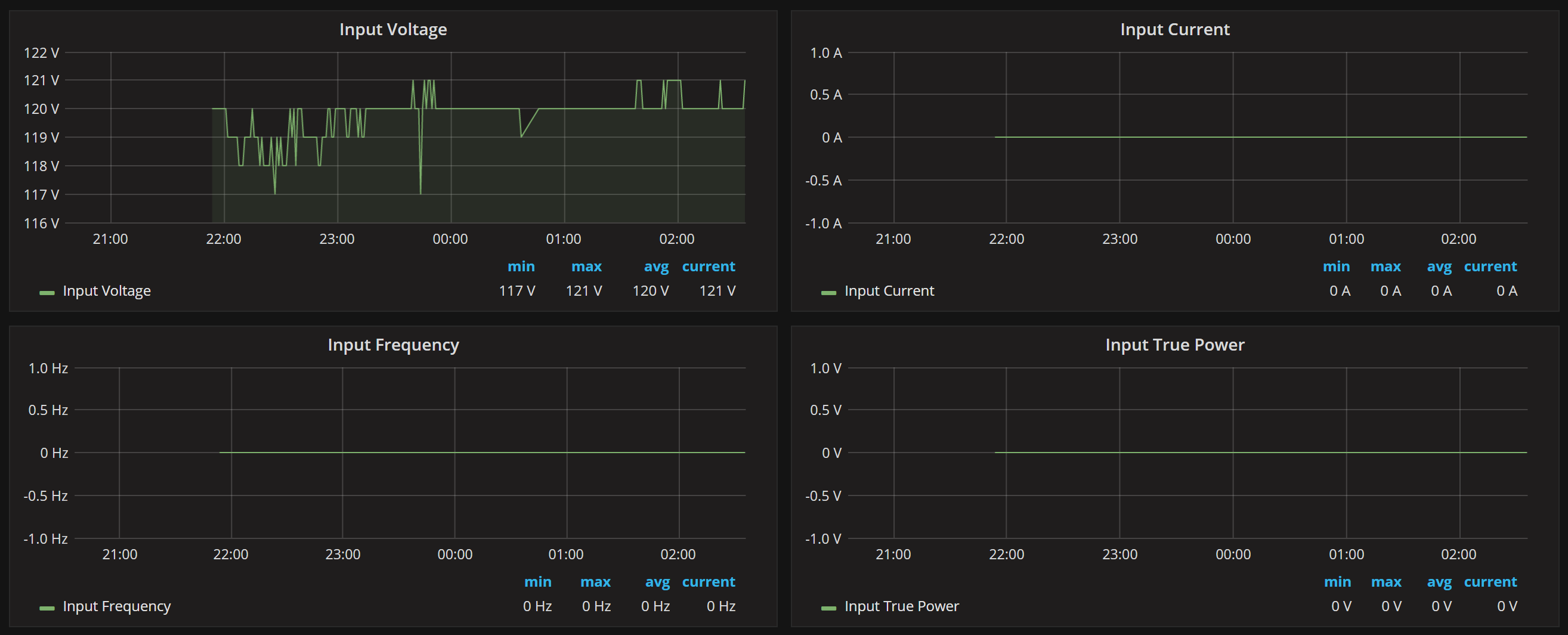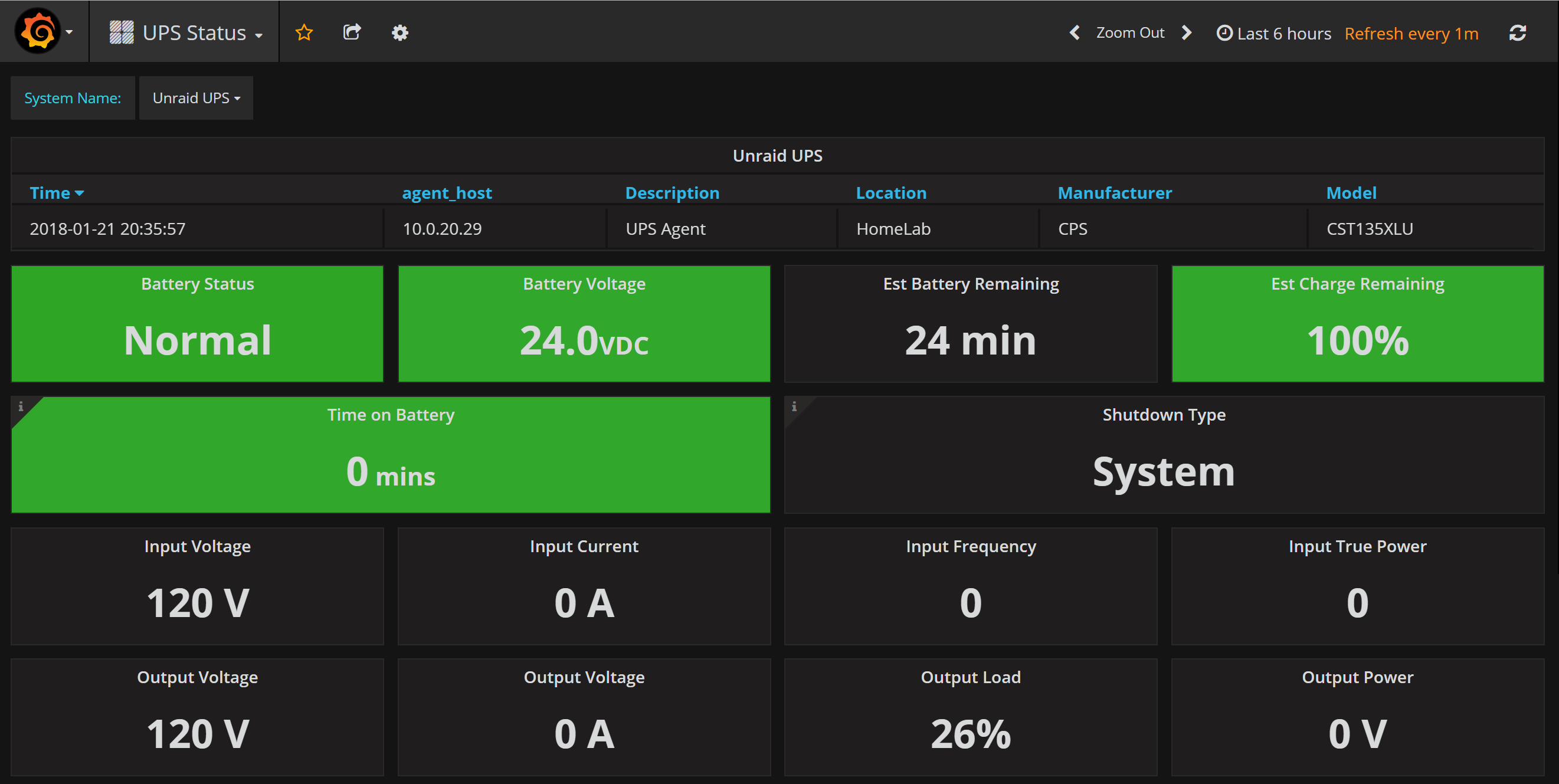 See how to install this dashboard here http://www.tgz.io/index.php/2018/01/22/cyberpower-ups-grafana-telegraf-snmp/