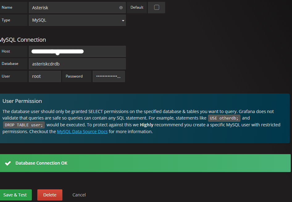 The Asterisk call statistics dashboard uses the mysql data source to create a Grafana dashboard with the graph and table panels.