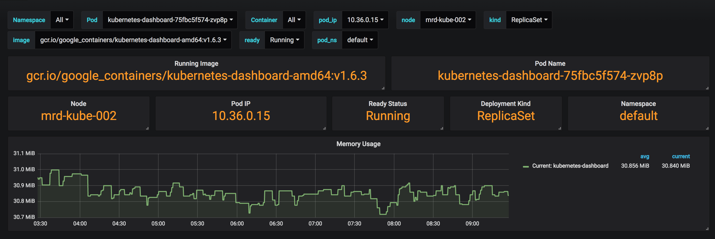 The Kubernetes Pods dashboard uses the prometheus data source to create a Grafana dashboard with the graph and text panels.