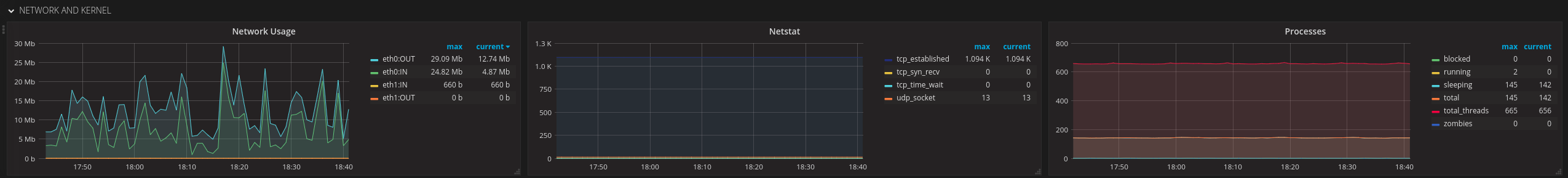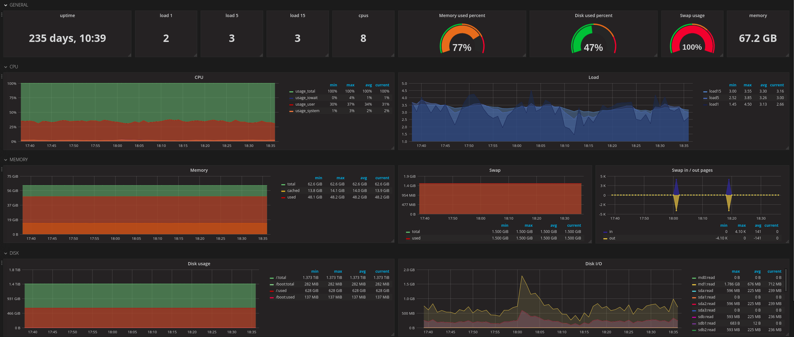 Dashboard presenting system statistics retrieved by Telegraf (CPU, Memory, Swap, Disk and Network usage)