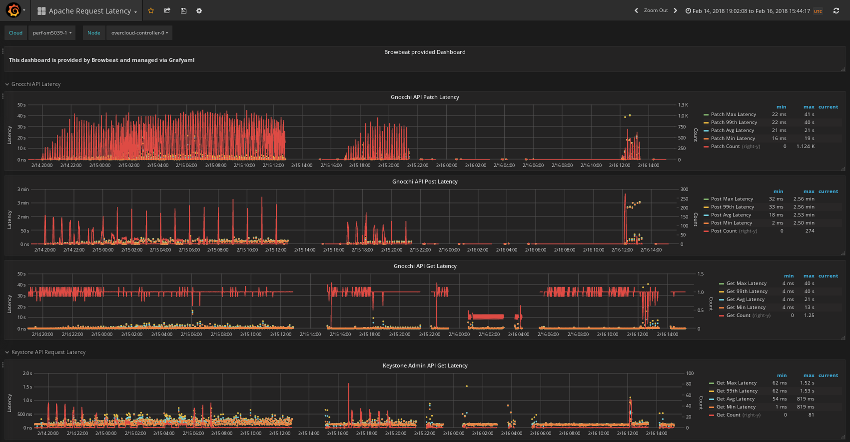 Displays Request Timing for requests made to Apache Hosted services for OpenStack (Gnocchi, Keystone Admin, Keystone Main, Nova placement api)