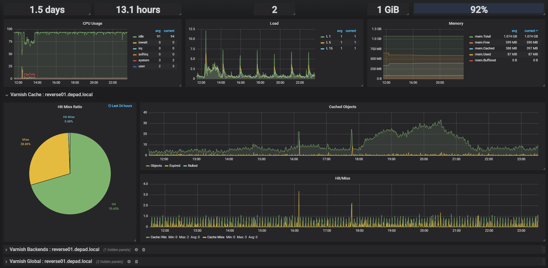 The Varnish dashboard uses the influxdb data source to create a Grafana dashboard with the grafana-piechart-panel, graph and singlestat panels.